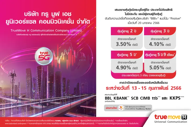 กลุ่มทรู เตรียมออกหุ้นกู้ TUC 4 ชุดใหม่ อัตราดอกเบี้ย 3.50-5.05% ต่อปี เสนอขายผู้ลงทุนทั่วไปและสถาบัน คาดเปิดให้จองซื้อ 13-15 กุมภาพันธ์ 2566