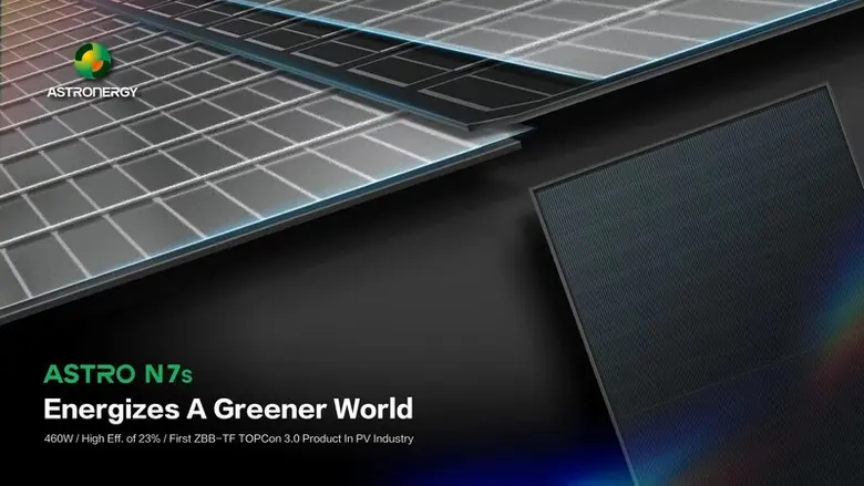 แอสโทรเนอร์จี (Astronergy) ได้เปิดตัวแผงโซลาร์เซลล์รูปแบบใหม่ที่เรียกว่า ASTRO N7s n-type TOPCon สำหรับใช้ในที่อยู่อาศัยและการผลิตไฟฟ้าแบบกระจาย (DG) ทั่วโลก แผงโซลาร์เซลล์นี้เป็นแผงแรกในโลกที่ใช้เทคโนโลยี ZBB (Zero BusBar Interconnection Technology) และ TF (Tiling Film) ทำให้ ASTRO N7s เป็นหนึ่งในผลิตภัณฑ์โมดูลโซลาร์เซลล์ที่มีประสิทธิภาพมากที่สุด โดยมีประสิทธิภาพการแปลงแสงอาทิตย์ให้เป็นไฟฟ้าได้มากกว่า 23% เมื่อเทียบกับผลิตภัณฑ์กระแสหลักอื่น ๆ ในกลุ่มเดียวกัน แอสโทรเนอร์จีเปิดตัวแผงโซลาร์เซลล์