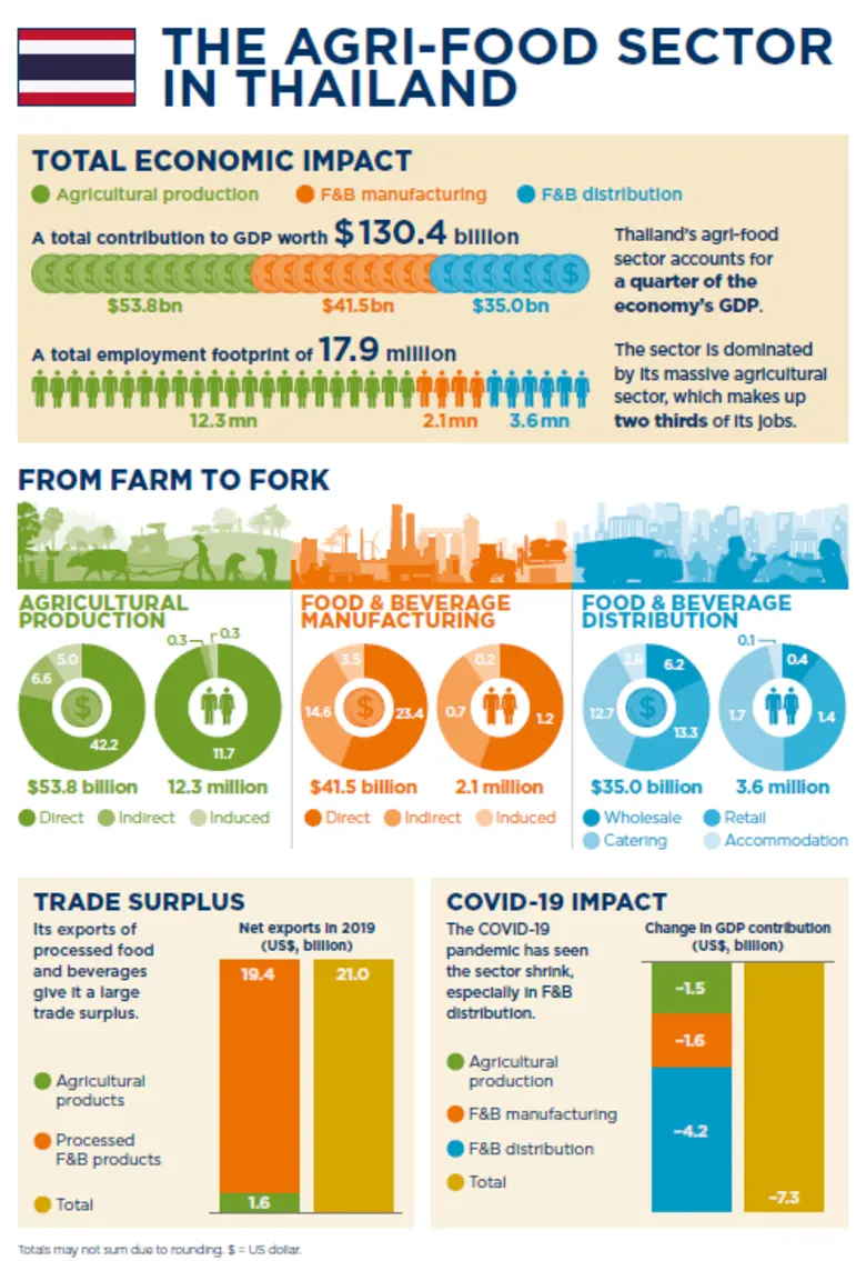 "The report shows just how vital the agri-food sector is to Thailand's economy. While the sector's contribution shrank because of the pandemic, it contracted by less than the economy as a whole. The industry is fully committed to working with the government to ensure we play a critical role in the post-pandemic recovery and that the agri-food sector remains a key driver of the economy," Mr Visit said.