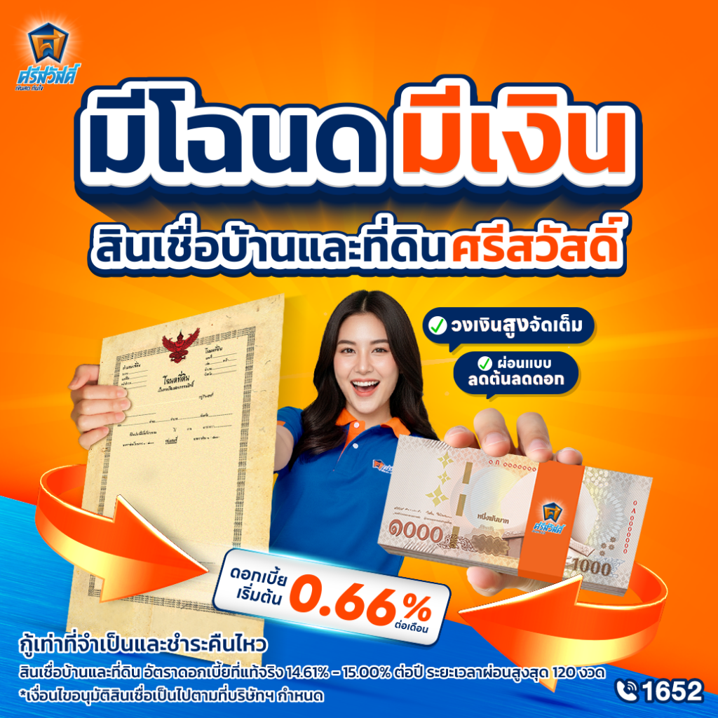 สนใจสอบถามข้อมูลเพิ่มเติมได้ที่ ศ. ศาลาสีส้มกว่า 6,000 สาขา หรือผ่านช่องทางออนไลน์ที่ www.sawad.co.th LINE Official: @srisawad และโทร. 1652 เพื่อรับคำปรึกษาฟรีแบบไม่มีค่าใช้จ่าย
