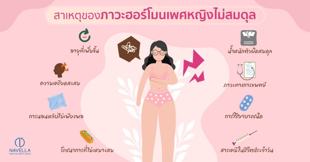 ภาวะฮอร์โมนเพศหญิงไม่สมดุลไม่ได้เกิดจากปัจจัยใดปัจจัยหนึ่งเพียงอย่างเดียว แต่เป็นผลจากหลายกลไกที่ทำงานร่วมกัน ทั้งจากการเปลี่ยนแปลงตามวัย พฤติกรรมการใช้ชีวิต ภาวะสุขภาพ และสิ่งแวดล้อมรอบตัว โดยปัจจัยสำคัญที่พบได้บ่อย ได้แก่