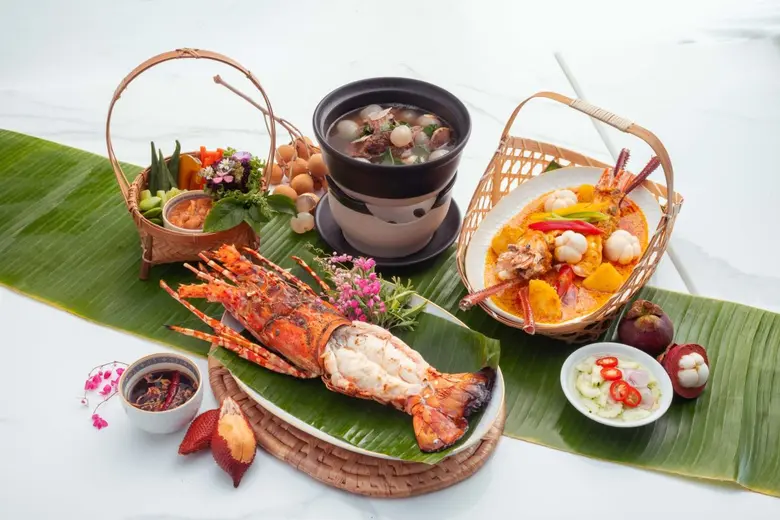 - แกงกะหรี่กุ้งแม่น้ำอยุธยากับมังคุดและหัวมันขี้หนูจากจังหวัดนครศรีธรรมราช ราคา 2,400++ บาท