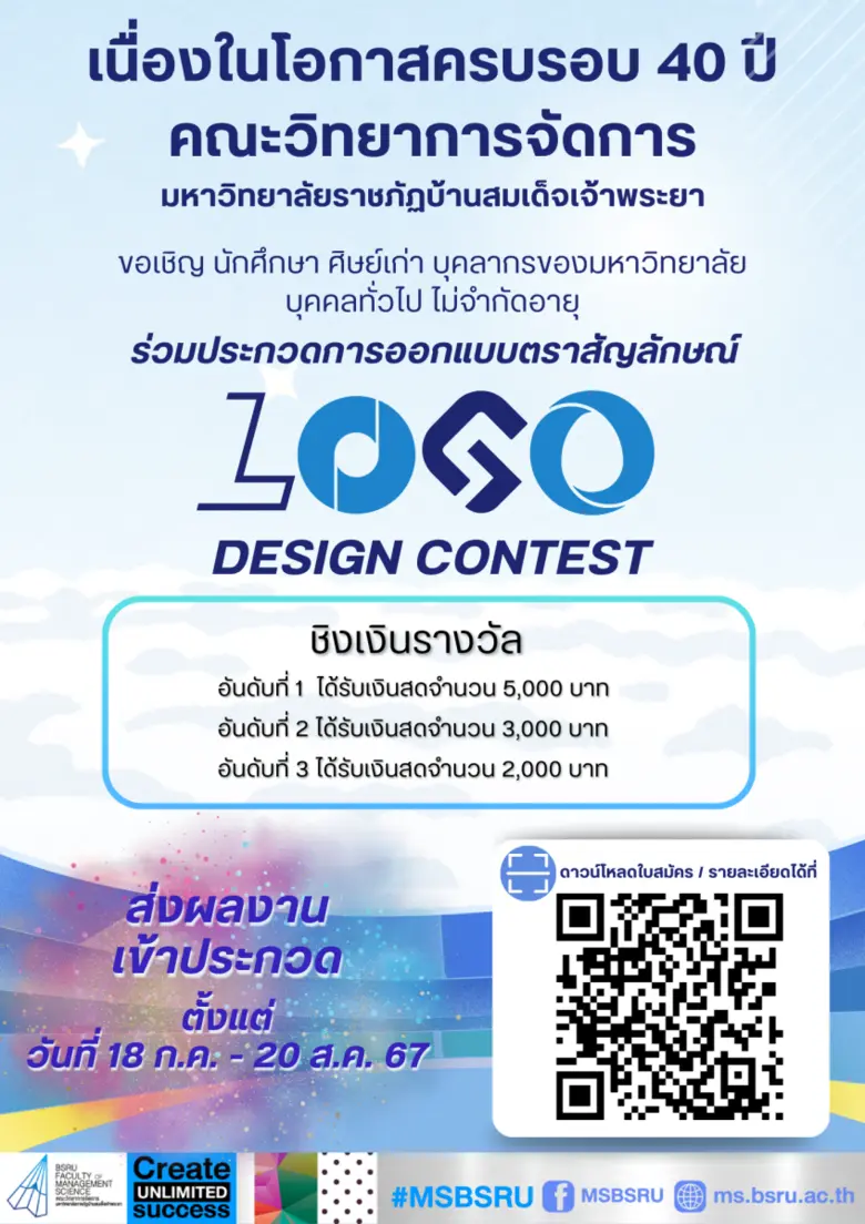 1.1 ผู้ที่มีสิทธิส่งผลงานเข้าประกวดออกแบบตราสัญลักษณ์ ได้แก่ นักศึกษา ศิษย์เก่า บุคลากรของมหาวิทยาลัย บุคคลทั่วไป ไม่จำกัดอายุ1.2 ผู้ส่งผลงานเข้าประกวด สามารถส่งได้ 1 คน ต่อ 1 ผลงาน เท่านั้น1.3 ตราสัญลักษณ์ (Logo) ต้องประกอบไปด้วยข้อความดังนี้ "40 ปี คณะวิทยาการจัดการ มบส."1.4 ตราสัญลักษณ์ (Logo) การออกแบบ ไม่จำกัดสี ไม่จำกัดรูปแบบ และตัวอักษร1.5 ผู้ส่งผลงานเข้าประกวดต้องเป็นผลงานที่ออกแบบด้วยตนเอง ไม่เคยส่งเข้าประกวดที่ใดมาก่อน ไม่ลอกเลียนแบบ ดัดแปลงหรือละเมิดลิขสิทธิ์ของผู้อื่น