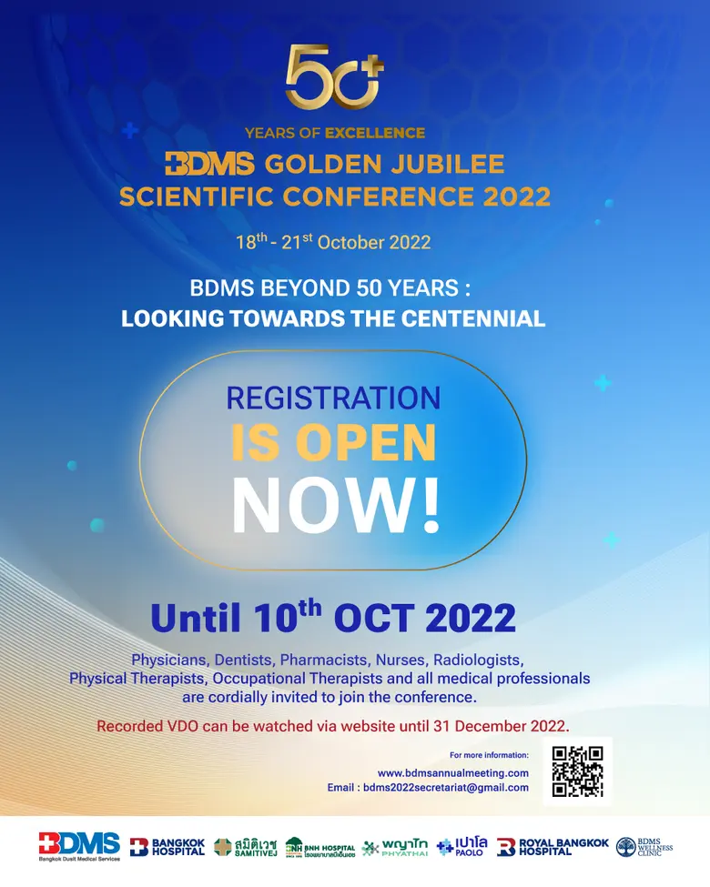 BDMS ขอเชิญชวนร่วมงานประชุมวิชาการออนไลน์ BDMS Golden Jubilee Scientific Conference 2022 วันที่ 18 - 21 ตุลาคม 2565