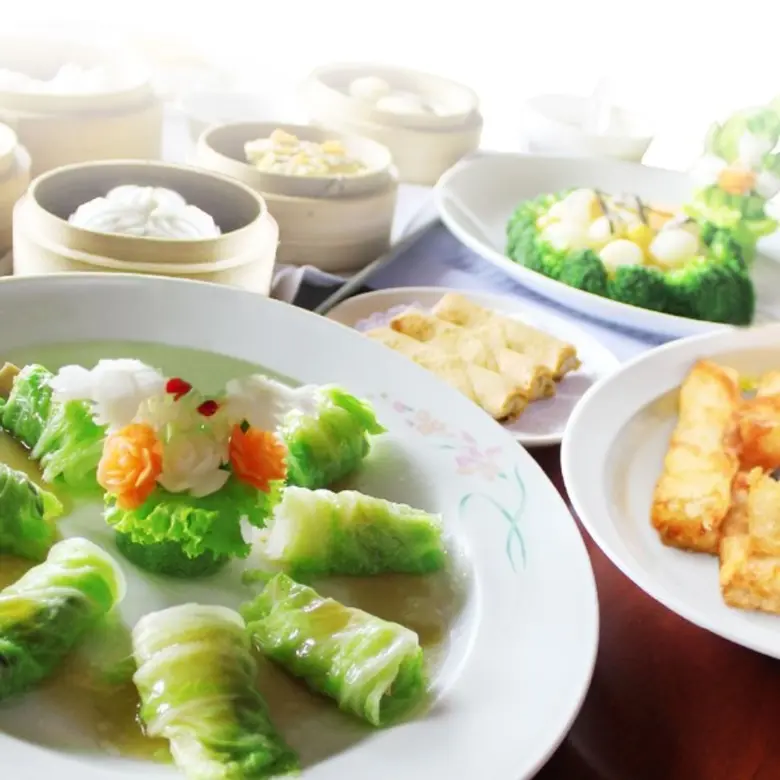 ที่ห้องอาหารจีนหยก บริการติ่มซำเจเฉพาะมื้อกลางวัน ราคาเข่งละ 120 บาท++ และอาหารเจตามสั่ง เช่น เป็ดปักกิ่งเจ มะเขือยาวผัดปลาเค็มเจหม้อดิน บะหมี่ผัดพริกไทยดำ ออเดิร์ฟร้อน-เย็นเจ 4 อย่างเป็นต้น ราคาเริ่มต้นที่ 190 บาท++