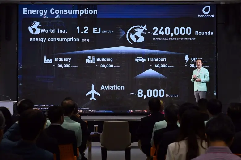 นายชัยวัฒน์ โควาวิสารัช ประธานเจ้าหน้าที่บริหารกลุ่มบริษัทบางจากและกรรมการผู้จัดการใหญ่ บริษัท บางจาก คอร์ปอเรชั่น จำกัด (มหาชน) กล่าวว่า "เป็นเวลาเกือบ 4 ทศวรรษแล้วที่บางจากฯ ก่อตั้งขึ้นด้วยภารกิจสร้างความมั่นคงด้านพลังงานให้กับประเทศและความยั่งยืนให้กับสังคมและสิ่งแวดล้อม ในวันนี้เรายังคงมุ่งมั่นดำเนินธุรกิจเพื่อตอบสนองภารกิจดังกล่าว ภายใต้วิสัยทัศน์ "รังสรรค์โลกยั่งยืนด้วยนวัตกรรมสีเขียว" โดยมีกลุ่มธุรกิจโรงกลั่นน้ำมันและการค้าน้ำมันเป็นหนึ่งในธุรกิจหลัก ซึ่งธุรกิจนี้ได้มีการพัฒนาผ่าน generation ต่าง ๆ จากเชื้อเพลิงฟอสซิลในช่วงเริ่มต้น สู่ยุคที่ 1 นำเอทานอลหรือไบโอดีเซลมาผสมในเชื้อเพลิงฟอสซิลเป็นรายแรกในประเทศไทย จนเป็นที่ยอมรับในฐานะ 'ผู้นำพลังงานทดแทน' และกำลังก้าวสู่ความเป็น 'ผู้นำพลังงานแห่งอนาคต' เข้าสู่ยุคที่ 2 ของโรงกลั่นด้วยการบุกเบิกการผลิตน้ำมันสำหรับอากาศยานที่จะช่วยลดการปล่อยก๊าซคาร์บอนไดออกไซด์สู่ชั้นบรรยากาศได้ถึง 80% ตลอดวงจรชีวิต เมื่อเทียบกับเชื้อเพลิงอากาศยานที่ผลิตจากฟอสซิล และเป็นการต่อยอดน้ำมันพืชที่ใช้แล้วจากการปรุงอาหารผ่านโครงการ "ทอดไม่ทิ้ง"