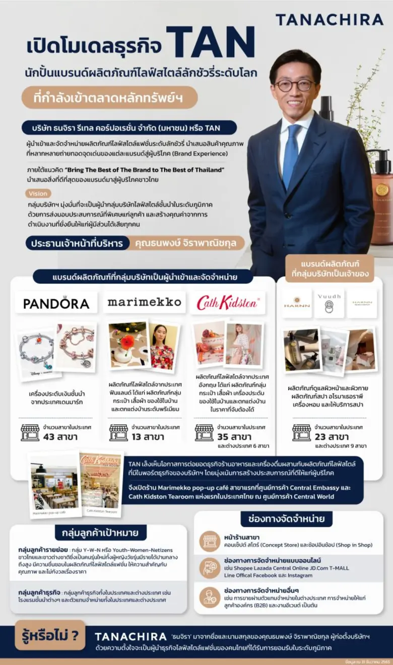 นายธนพงษ์ จิราพาณิชกุล ประธานเจ้าหน้าที่บริหาร บริษัท ธนจิรา รีเทล คอร์ปอเรชั่น จำกัด (มหาชน) หรือ TAN เปิดเผยว่า กลุ่มบริษัทฯ ประกอบธุรกิจนำเข้าและจัดจำหน่ายผลิตภัณฑ์ไลฟ์สไตล์และแฟชั่นจากต่างประเทศที่เป็นแบรนด์ชื่อดังระดับโลก เพื่อจัดจำหน่ายในประเทศไทยและต่างประเทศ โดยใช้ความเชี่ยวชาญด้านการนำเสนอแบรนด์ผลิตภัณฑ์ไลฟ์สไตล์ให้เป็นที่รู้จักในประเทศไทย โดยการเป็นตัวกลางระหว่างเจ้าของแบรนด์และผู้บริโภค ผ่านการนำเสนอความหลากหลายของผลิตภัณฑ์ที่มากด้วยคุณภาพ ถ่ายทอดจุดเด่นของแต่ละแบรนด์สู่ผู้บริโภค (Brand Experience) เพื่อให้ผู้บริโภคได้รับสิ่งที่ดีที่สุด ด้วยความตั้งใจของกลุ่มบริษัทฯ ที่มีเป้าหมายในการนำเสนอสิ่งที่ดีที่สุดของแบรนด์มาสู่ผู้บริโภคชาวไทย ภายใต้แนวคิด "Bring The Best of The Brand to The Best of Thailand"