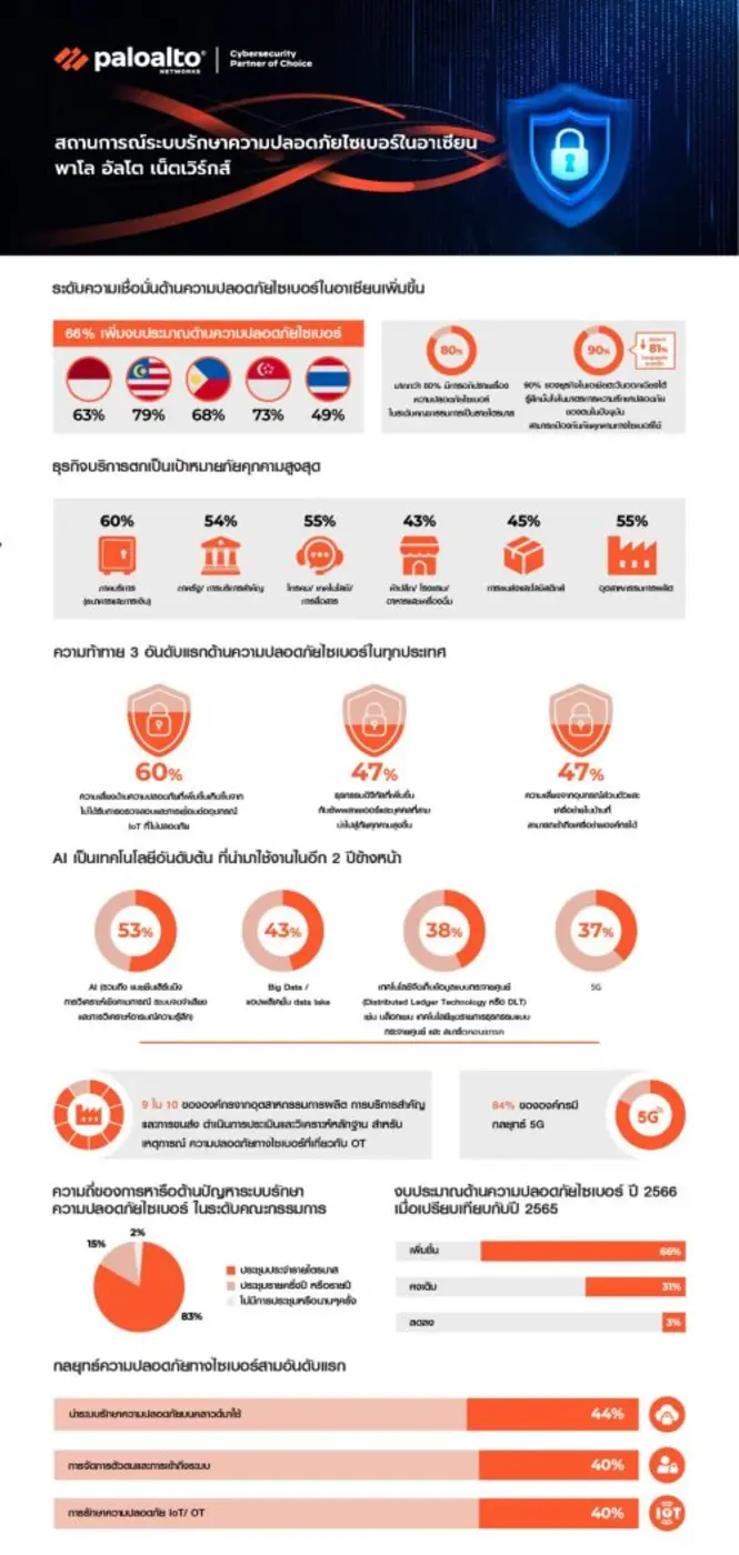 วันนี้ พาโล อัลโต เน็ตเวิร์กส์ (NASDAQ: PANW) ผู้นำระดับโลกด้านระบบรักษาความปลอดภัยไซเบอร์ เปิดเผยรายงานสถานการณ์ระบบรักษาความปลอดภัยไซเบอร์ในอาเซียนปี 2566 ข้อมูลในรายงานระบุว่า เมื่อปีที่ผ่านมาประเทศไทยพบปัญหา "การโจมตีที่สร้างความเสียหายอย่างหนัก" ในปริมาณน้อยที่สุด โดยมีองค์กร 22% ที่พบจำนวนอุบัติการณ์เพิ่มขึ้นมากกว่า 50% เมื่อเทียบกับในอดีต ทั้งนี้ การปกป้องเทคโนโลยีเชิงปฏิบัติการ (OT) โดยเฉพาะระบบที่เกี่ยวข้องกับโครงสร้างพื้นฐานสำคัญยังคงเป็นข้อกังวลหลัก เพราะบริการพื้นฐานสำคัญเหล่านั้นต้องเผชิญกับการโจมตีที่สร้างความเสียหายในระดับที่สูงกว่าภาคส่วนอื่นๆ