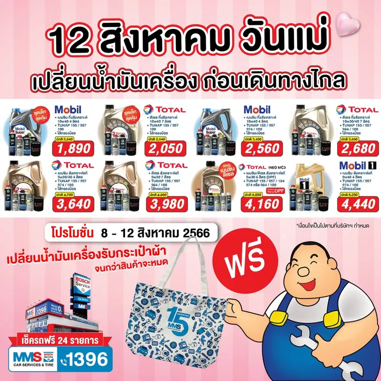 บริษัท มาสเตอร์ มอเตอร์ เซอร์วิสเซส (ประเทศไทย) จำกัด ภายใต้บริษัท มิลเลนเนียม กรุ๊ป คอร์ปอเรชั่น (เอเชีย) จำกัด (มหาชน) หรือ เอ็มจีซี-เอเชีย ศูนย์บริการซ่อมบำรุงรถยนต์แบบครบวงจร เอ็มเอ็มเอส บ๊อช คาร์ เซอร์วิส แอนด์ ไทร์ สำหรับรถญี่ปุ่นและยุโรปที่หมดระยะการรับประกัน ห่วงใยผู้ใช้รถยนต์ช่วงหยุดยาวเทศกาลวันแม่แห่งชาติ จัดแคมเปญสุดพิเศษ ชวนคุณแม่นำรถยนต์เข้าตรวจสภาพฟรี! 24 รายการ พร้อมรับของที่ระลึกสไตล์รักษ์โลก ที่ MMS ทั้ง 22 สาขาทั่วประเทศ
