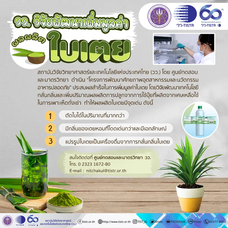 ดร.ชุติมา เอี่ยมโชติชวลิต ผู้ว่าการ วว. กล่าวถึงการดำเนินโครงการพัฒนาศักยภาพอุตสาหกรรมและนวัตกรรมอาหารปลอดภัยของ วว. โดย ศูนย์ทดสอบและมาตรวิทยา ว่า ได้นำร่องดำเนินโครงการ ณ จังหวัดพิษณุโลก โดยใช้องค์ความรู้วิทยาศาสตร์ เทคโนโลยีและนวัตกรรม เข้าไปพัฒนาร่วมกับเกษตรกร เพื่อพัฒนาองค์ความรู้ ต่อยอดฐานความเข้มแข็งเดิมในส่วนผลผลิตทางการเกษตรเพื่อเพิ่มมูลค่าให้กับสินค้า โดยรับโจทย์จากเกษตรกรและผู้ประกอบการที่ปลูกเตยหอมเพื่อจำหน่ายในอุตสาหกรรมอาหาร ผลการดำเนินงานประสบผลสำเร็จในการเพิ่มปริมาณผลผลิตการปลูกเตยหอม สามารถตัดใบได้ในปริมาณที่มากกว่าและมีกลิ่นของเตยหอมที่โดดเด่นกว่า พร้อมทั้งเพิ่มมูลค่าของสินค้าทางการเกษตรด้วยการแปรรูปเป็นเครื่องดื่มน้ำจากการกลั่นกลิ่นใบเตย ทั้งนี้จากการทดสอบผลิตภัณฑ์เครื่องดื่มกับผู้บริโภคพบว่า มีความพึงพอใจกับรสชาติและสนับสนุนให้ผลิตจำหน่ายให้เพียงพอกับความต้องการต่อไป