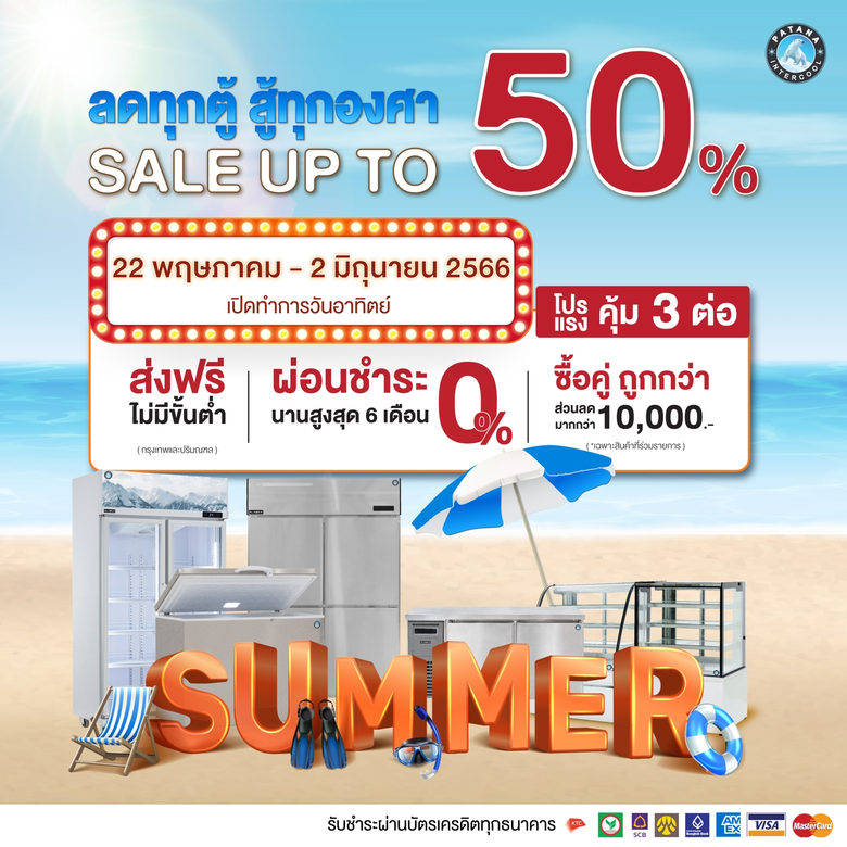 "สำหรับมหกรรม "Summer Sale โปรแรง คุ้ม 3 ต่อ" ครั้งนี้ ทางบริษัทฯ ได้เตรียมสินค้าคุณภาพมากมาย กว่า 100 รายการ อาทิ ตู้แช่เย็น, ตู้เค้ก และอุปกรณ์ครัวสเตนเลสฯ ที่นำมาลดสูงสุดถึง 50% พร้อมจัดโปรโมชั่นสุดฮ็อต ที่มอบความคุ้มถึง 3 ต่อในงานนี้งานเดียว ได้แก่ ซื้อคู่ถูกกว่าลดสูงสุด 10,000 บาท* พร้อมบริการจัดส่งสินค้าฟรี* ในพื้นที่กรุงเทพและปริมณฑล และสามารถผ่อนสินค้า 0% นานสูงสุด 6 เดือน* อีกด้วย