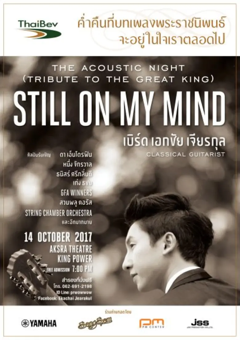 ภาพข่าว: น้อมรำลึกถึงพระองค์ท่านฯผ่านบทเพลงพระราชนิพนธ์ ผ่านฟรีคอนเสิร์ต คอนเสิร์ต “Still On My Mind” The Acoustic night (Tribute to the great king) Presented by Thai Beverage