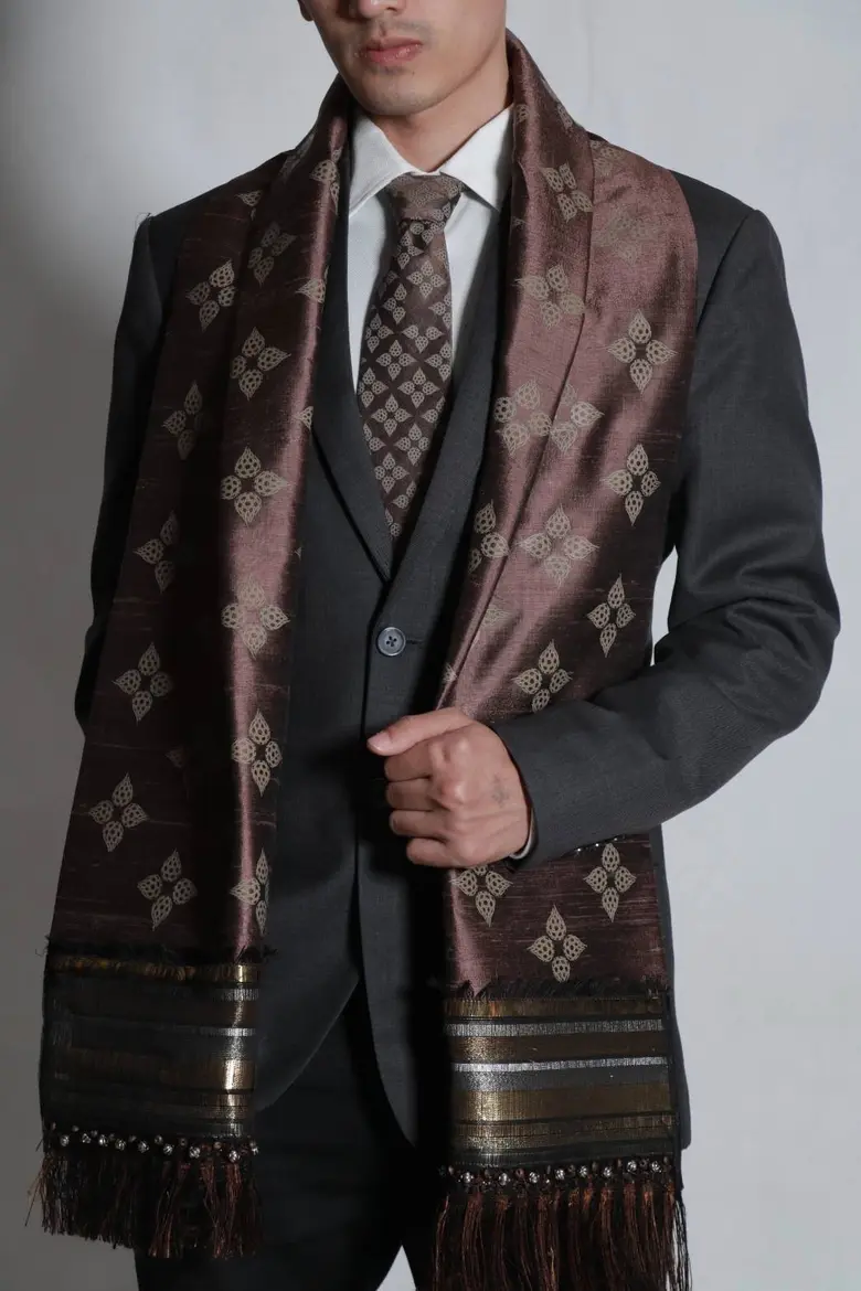 ด้วยแนวคิดการทำชุดเครื่องใช้จากผืนผ้าไหมไทยพื้นบ้านภูมิปัญญาพื้นถิ่นที่สืบสานยาวนานให้สามารถใช้ร่วมกับยุคสมัยกับประโยชน์ใช้สอย ผู้สร้างสรรค์จึงคัดเลือกผ้าไหมปักธงชัยที่ย้อมด้วยสีธรรมชาติจากเปลือกมะพร้าวเหลือทิ้ง มาพิมพ์ลายประจำยาม "ชะลอมโมโนแกรม" แล้วนำไปออกแบบตัดเย็บเป็นเครื่องใช้จากผ้าประเภทต่าง ๆ ตามยุคสมัย โดยเพิ่มมูลค่า และสนับสนุนแนวคิดหลักด้วยการร้อยต่อผ้าจากเส้นใยรีไซเคิลของโลหะประกายสีทองรุ่งโรจน์กับปลายผ้าคลุมไหล่ แต่งชายด้วยลูกปะเกือมสีเงินที่เป็นมรดกภูมิปัญญาทางวัฒนธรรมของชาติแห่งจังหวัดสุรินทร์ ปิดปลายด้วยผ้าทอแบบทวิตจากเศษผ้าไทยเหลือทิ้ง แสดงให้เห็นถึงการผสานงานผ้าไหมและวัฒนธรรมไทยกับประโยชน์ใช้สอยและแนวคิดร่วมสมัยได้อย่างลงตัวงดงาม