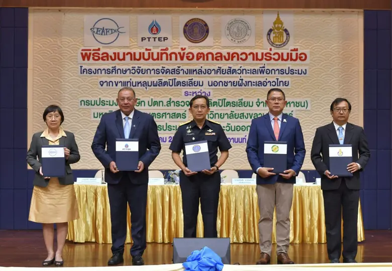 กรมประมง ร่วมกับ บริษัท ปตท.สำรวจและผลิตปิโตรเลียม จำกัด (มหาชน) หรือ ปตท.สผ. มหาวิทยาลัยเกษตรศาสตร์ มหาวิทยาลัยสงขลานครินทร์ และศูนย์พัฒนาการประมงแห่งเอเชียตะวันออกเฉียงใต้ (SEAFDEC) ลงนามบันทึกข้อตกลงความร่วมมือ (MOA) เพื่อร่วมกันศึกษาวิจัยการจัดสร้างแหล่งอาศัยสัตว์ทะเลเพื่อการประมงจากขาแท่นหลุมผลิตปิโตรเลียมนอกชายฝั่งอ่าวไทย ณ ห้องประชุมอานนท์ กรมประมง กรุงเทพฯ