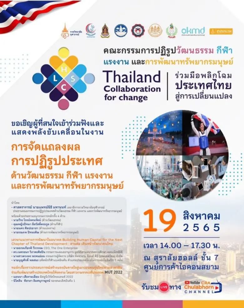 คณะกรรมการปฏิรูปประเทศด้านวัฒนธรรม กีฬา แรงงาน และการพัฒนาทรัพยากรมนุษย์ ร่วมกับ ราชวิทยาลัยจุฬาภรณ์, ศูนย์คุณธรรม (องค์การมหาชน), กระทรวงวัฒนธรรม, กระทรวงการท่องเที่ยวและกีฬา, สถาบันคุณวุฒิวิชาชีพ (องค์การมหาชน), สำนักงานสภาพัฒนาการเศรษฐกิจและสังคมแห่งชาติ, การกีฬาแห่งประเทศไทย, สำนักงานบริหารและพัฒนาองค์ความรู้ (องค์การมหาชน), สำนักงานคณะกรรมการข้าราชการพลเรือน และหน่วยงานอื่นๆที่เกี่ยวข้อง บูรณาการจัดแถลงผลการปฏิรูปประเทศด้านวัฒนธรรม กีฬา แรงงาน และการพัฒนาทรัพยากรมนุษย์ ระหว่างปี พ.ศ. 2563 - 2565 ภายใต้แนวคิด ความร่วมมือด้านวัฒนธรรม กีฬา แรงงาน และการพัฒนาทรัพยากรมนุษย์ พลิกโฉมประเทศไทยสู่การเปลี่ยนแปลง : CSLH Thailand Collaboration for Change นำโดย ศาสตราจารย์ นายแพทย์นิธิ มหานนท์ ประธานกรรมการปฏิรูปฯ พร้อมด้วยประธานอนุกรรมการหลักทั้ง 4 ด้าน ประกอบด้วย นายวีระ โรจน์พจนรัตน์ (ด้านวัฒนธรรม) คุณหญิงปัทมา ลีสวัสดิ์ตระกูล (ด้านกีฬา) นายนคร ศิลปะอาชา (ด้านแรงงาน) นายรณภพ ปัทมะดิษ (ด้านการพัฒนาทรัพยากรมนุษย์) พร้อมรับฟังการเสนอมุมมองแนวทางการปฏิรูปและพัฒนาประเทศในอนาคต ในหัวข้อ Building Human Capital for the Next Chapter of Thailand Development : สานต่อ เดินหน้าพัฒนาคนไทย ร่วมเสวนากับ นายถกลเกียรติ วีรวรรณ CEO, The One Enterprise ดร.เนตรชนก วิภาตะศิลปิน กรรมการและเลขานุการ มูลนิธิสานอนาคตการศึกษา คอนเน็กซ์อีดี นางสาวดวงพร พรหมอ่อน กรรมการผู้จัดการ บริษัท จัดหางาน จ๊อบส์ ดีบี (ประเทศไทย) จำกัด และนายบุญศักดิ์ พลสนะ อดีตนักกีฬาแบดมินตัน ตัวแทนประเทศไทยในการแข่งโอลิมปิก 5 สมัย และพบกับสาวงามจากคณะมิสยูนิเวิร์สไทยแลนด์ 2022 นำโดยแอนนา เสืองามเอี่ยม มิสยูนิเวิร์สไทยแลนด์ 2022 นิโคลีน พิชาภา ลิมศนุกาญจน์ รองชนะเลิศอันดับที่ 1 อาย-กัญญาลักษณ์ หนูแก้ว รองชนะเลิศอันดับที่ 2 โอปอล-สุชาตา ช่วงศรี รองชนะเลิศอันดับที่ 3 และเรเน่-เรนิตา เวโรนิก้า ปากาโน รองชนะเลิศอันดับที่ 4 โดยมี แอนนา เสืองามเอี่ยม และนิโคลีน พิชาภา ลิมศนุกาญจน์ ร่วมขึ้นเวทีทอล์กเสนอมุมมองชีวิตจากเรื่องราวประสบการณ์จริง สร้างแรงบันดาลใจสู่เยาวชนคนรุ่นใหม่ตามล่าหาฝัน ร่วมกันพัฒนาสร้างประเทศไทยให้งดงาม