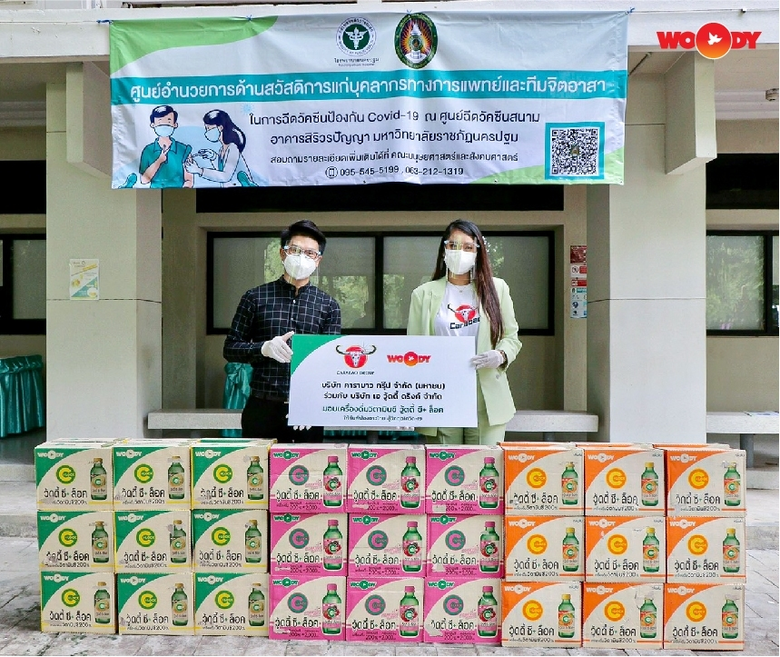 บริษัท คาราบาวกรุ๊ป จำกัด (มหาชน) ร่วมกับ บริษัท เอ วู้ดดี้ ดริงค์ จำกัด ยังคงสานต่อเดินหน้าภารกิจสนับสนุนการทำงานของหน่วยงานภาครัฐ โรงพยาบาลสนาม และหน่วยงานจิตอาสา คุณกนกกร ใจชื่น ฝ่ายประชาสัมพันธ์ ในนามบริษัท คาราบาวกรุ๊ป จำกัด (มหาชน) มอบความห่วงใยพร้อมสุขภาพดีด้วยผลิตภัณฑ์คุณภาพเครื่องดื่ม "วู้ดดี้ ซี+ ล็อค" กลิ่นเลมอน กลิ่นส้ม และกลิ่นมิกซ์เบอรรี่ ที่อุดมไปด้วยวิตามินซีสูง 200% ให้กับมหาวิทยาลัยราชภัฎนครปฐม จ.นครปฐม ซึ่งเป็นศูนย์กลางการฉีดวัคซีน ณ ศูนย์ฉีดวัคซีนสนาม โรงพยาบาลนครปฐม เพื่อเสริมสร้างภูมิคุ้มกัน และมอบเป็นกำลังใจให้กับแพทย์ พยาบาล เจ้าหน้าที่สนาม และจิตอาสา ในช่วงสถานการณ์การแพร่ระบาดของไวรัสโควิด-19 ทีมีแผนการดำเนินการปูพรมการฉีดวัคซีน ให้ประชาชนในเขตพื้นที่อย่างเร่งด่วน ตามนโยบายของภาครัฐ