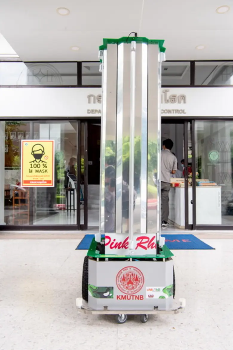 ศ.ดร.สุชาติ เซี่ยงฉิน อธิการบดี พร้อมด้วยคุณภรณี ลีนุตพงษ์ กรรมการสภามหาวิทยาลัยผู้ทรงคุณวุฒิ ผศ.สมชาย เวชกรรม รองอธิการบดีฝ่ายกิจการนักศึกษาและศิษย์เก่าสัมพันธ์ อาจารย์ ดร.สราวุฒิ สืบแย้ม ผู้ช่วยอธิการบดีการคลังและกิจการทั่วไป ผศ.ดร.ณัฐพงศ์ มกระธัช ผู้ช่วยอธิการบดีฝ่ายพัฒนาสิ่งแวดล้อมและกายภาพ และทีมผู้วิจัย รศ.ดร.ศุภชัย ตระกูลทรัพย์ทวี และผศ.ดร.สถาพร วังฉาย มหาวิทยาลัยเทคโนโลยีพระจอมเกล้าพระนครเหนือ (มจพ.) ร่วมมอบหุ่นยนต์ประดู่แดงฉายแสง UVC รับมอบโดย นพ.ปรีชา เปรมปรี รองอธิบดีกรมควบคุมโรค กระทรวงสาธารณสุข เพื่อนำไปใช้ที่สถาบันบำราศนราดูร ณ วันที่ 9 มิถุนายน 2564นวัตกรรมหุ่นยนต์ประดู่แดงฉายแสง UVC มีวัตถุประสงค์เพื่อสนับสนุนการสร้างนวัตกรรมต่าง ๆ สำหรับป้องกัน ควบคุม หรือรักษาโรคติดเชื้อไวรัสโคโรนา 2019 (COVID-19) หรือโควิด 19 (Coronavirus Disease 2019 (COVID-19)) และโรคติดเชื้ออื่น ๆ ให้กับสถานพยาบาล และหน่วยงานต่าง ๆ เป็นการออกแบบสร้างหุ่นฉายรังสี UVC ระบบควบคุมไร้สายด้วยคลื่นวิทยุ เพื่อฆ่าเชื้อไวรัส และเพื่อเผยแพร่เทคโนโลยีและการนำเทคโนโลยีใช้ให้เกิดประโยชน์สู่สังคม ขนาดหุ่นยนต์ประดู่แดงฉายแสง UVC 68x78x180 ซม.และใช้หลอดรังสียูวีที่สามารถฆ่าเชื้อโรคได้ ได้แก่ หลอดไอปรอทแรงดันต่ำ เปล่งรังสี 254 nm/หลอดอะมัลกัม เปล่งรังสี 254 nm/ หลอด UV LED ที่แปล่งรังสีในช่วง 242-313 nm หรือ 260-265 nmทั้งนี้ มหาวิทยาลัยขอเชิญชวนผู้ที่มีจิตศรัทธาร่วมบริจาคเงินเพื่อพัฒนาและสร้างนวัตกรรมช่วยเหลือการแพทย์ในสถานการณ์การแพร่ระบาดของ COVID-19