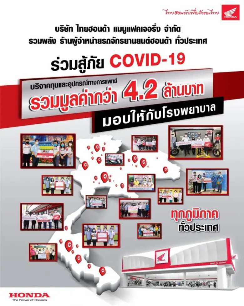 บริษัท ไทยฮอนด้า แมนูแฟคเจอริ่ง จำกัด ผู้ผลิตและจัดจำหน่ายรถจักรยานยนต์ฮอนด้าในประเทศไทย ร่วมกับเครือข่ายร้านผู้จำหน่ายรถจักรยานยนต์ฮอนด้าทั่วประเทศ ร่วมส่งมอบเงินบริจาคและอุปกรณ์ทางการแพทย์รวมมูลกว่า 4.2 ล้านบาท ให้กับโรงพยาบาลทุกภูมิภาค ภายใต้โครงการ "ไทยฮอนด้าเพื่อสังคมไทย" เพื่อสนับสนุนบุคลากรทางการแพทย์ในการรับมือกับสถานการณ์การแพร่ระบาดของไวรัสโควิด-19