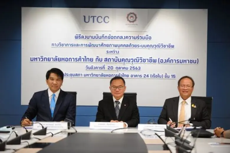 ล่าสุดมหาวิทยาลัยหอการค้าไทยจัดพิธีลงนามบันทึกความร่วมมือทางวิชาการและการพัฒนาศักยภาพบุคคลด้วยระบบคุณวุฒิวิชาชีพระหว่างสถาบันคุณวุฒิวิชาชีพ (องค์การมหาชน) กับ มหาวิทยาลัยหอการค้าไทย โดยมี ดร.นพดล ปิยะตระภูมิ ผู้อำนวยการสถาบันคุณวุฒิวิชาชีพ และผู้ช่วยศาสตราจารย์ ดร.ธนวรรธน์ พลวิชัย อธิการบดีมหาวิทยาลัยหอการค้าไทย ทำบันทึกข้อตกลงฉบับนี้อยู่บนพื้นฐานของความร่วมมือทั้งสองฝ่าย โดยทั้งสองฝ่ายมีความประสงค์ที่จะร่วมมือกันพัฒนาศักยภาพบุคคลด้วยระบบคุณวุฒิวิชาชีพ เพื่อสร้างคนมืออาชีพสู่ภาคธุรกิจและอุตสาหกรรมบริการ พร้อมกับร่วมกันพัฒนาการเรียนการสอนที่มีการปรับทักษะและให้ทักษะใหม่ตรงต่อโจทย์โลกธุรกิจ และร่วมกันส่งเสริมการประเมินสมรรถนะของบุคคลตามมาตรฐานอาชีพและคุณวุฒิวิชาชีพ ตลอดจนผลักดันให้เกิดการศึกษาวิจัยและพัฒนาหลักสูตรฐานสมรรถนะด้วยมาตรฐานอาชีพและคุณวุฒิวิชาชีพ เพื่อให้สามารถผลิตบุคลากรที่มีสมรรถนะพร้อมต่อการทำงาน ที่ทันต่อการเปลี่ยนแปลง