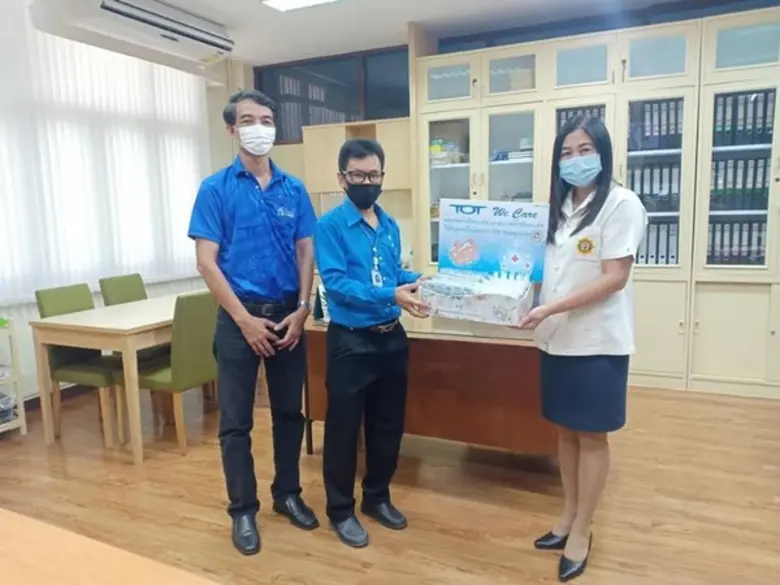 คณะทำงานโครงการ TOT Young Club ส่วนการขายและลูกค้าสัมพันธ์ที่ 3.3 เป็นผู้แทนมอบผลิตภัณฑ์แอลกอฮอล์เจลล้างมือและสเปรย์ล้างมืออนามัยให้กับโรงเรียนชุมชนราษฎร์นิยม จ.นนทบุรี