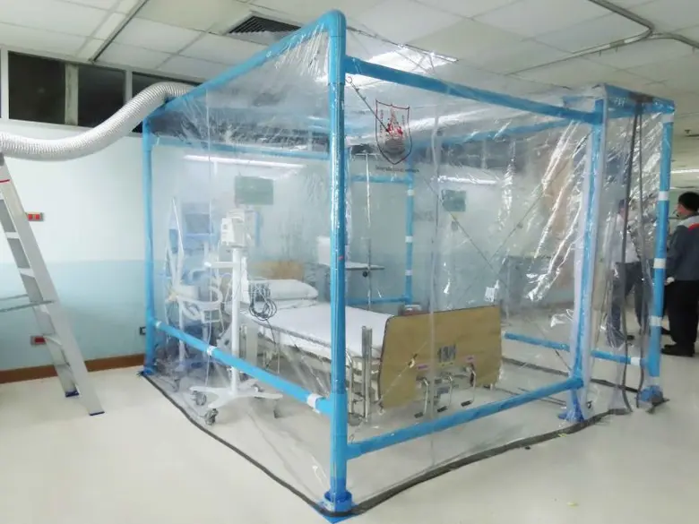 สำหรับระบบโครงสร้างตู้ความดันลบ เป็นวัสดุภายในประเทศ เป็นมิตรกับสิ่งแวดล้อม ปลอดภัยต่อการใช้งาน ดูแลบำรุงรักษา และทำความสะอาดห้องได้ง่าย วัสดุส่วนประกอบ ได้แก่ ท่อพีวีซี, ข้องอ 90 องศา , ข้อต่อสามทาง , ข้อต่อท่อรูกันซึม , เกลียวเร่ง (Turnbuckle) , Clamp รัดสลิง , เกลียวปล่อย และลวดสลิง ผนังคลุมด้วยแผ่นพลาสติกใสมาตรฐาน GMP หนา 60 ไมครอน ตู้ความดันลบนี้ต้องผ่านสองเงื่อนไขหลักคือความสะอาดและความดันห้อง ในส่วนความสะอาดของห้องจะมีการนำอากาศจากภายนอกห้องไหลเข้ามาเจือจางอากาศที่ปนเปื้อนภายในห้อง โดยใช้ พัดลมดูดอากาศ ที่ด้านหัวเตียงคนไข้ในอัตราไม่น้อยกว่า 12 ครั้งต่อชั่วโมง(ACH) เพื่อนำอากาศที่เจือจางนี้ทั้งหมด (100%) ไปปล่อยทิ้งนอกอาคารในระยะห่างจากอาคารไม่น้อยกว่า 8.00 เมตร หรือปล่อยทิ้งที่หลังคาให้สูงอย่างน้อย 3.00 เมตร โดยไม่นำอากาศที่เจือจางนี้กลับมาใช้ใหม่ รวมทั้งจะต้องไมให้อากาศที่เจือจางนี้สามารถไหลกลับเข้ามาในอาคารได้ระบบท่อระบายอากาศทิ้งนี้หากไม่สามารถติดตั้งให้มีระยะห่างจากอาคาร 8.00 เมตร หรือทิ้งที่หลังคาสูง 3.00 เมตรได้ ก็สามารถดัดแปลงให้ใส่เครื่องกรองอากาศประสิทธิภาพสูง(HEPA) ทำการฆ่าเชื้อก่อนระบายทิ้งสู่บรรยากาศได้ สำหรับในส่วนความดันห้องจะรักษาระดับความดันลบภายในห้องให้น้อยกว่า 2.5 ปาสกาล(Pa) เทียบกับความดันอากาศบริเวณโดยรอบ ส่วนระดับอุณหภูมิอากาศภายนอกและภายในห้องให้แตกต่างกันไม่เกินบวกลบ 2 องศาเซลเซียส