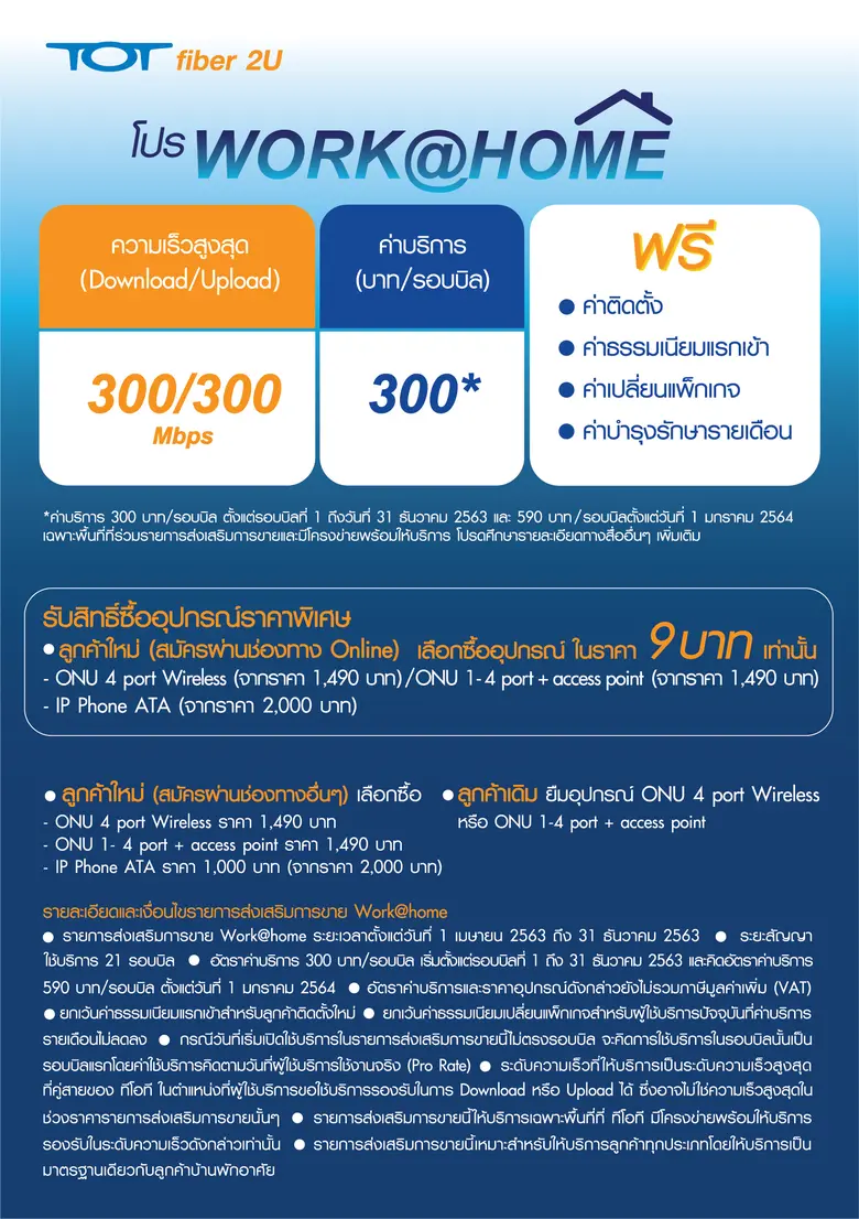 แพ็กเกจ “Work @ home” ความเร็ว 300/300 Mbps ในราคาค่าบริการพิเศษเพียง 300 บาท/รอบบิล เริ่มตั้งแต่การใช้รอบบิลที่ 1 ถึงวันที่ 31 ธันวาคม 2563 และปรับเป็นราคา 590 บาท/รอบบิล ตั้งแต่วันที่ 1 มกราคม 2564 ระยะสัญญา 21รอบบิล พร้อมฟรี! ค่าติดตั้ง ค่าธรรมเนียมแรกเข้าหรือเปลี่ยนแพ็กเกจ และค่าบำรุงรักษารายเดือน ทั้งยังได้รับสิทธิ์ซื้ออุปกรณ์เสริมราคาพิเศษ ทั้งนี้ แพ็กเกจ “Work @ home” รองรับการใช้งานของทุกกลุ่ม เพื่อให้การทำงานและชีวิตประจำวันดำเนินไปอย่างราบรื่นด้วยแพลตฟอร์มออนไลน์มากมาย สมัครได้ตั้งแต่วันนี้ - 31 ธันวาคม2563