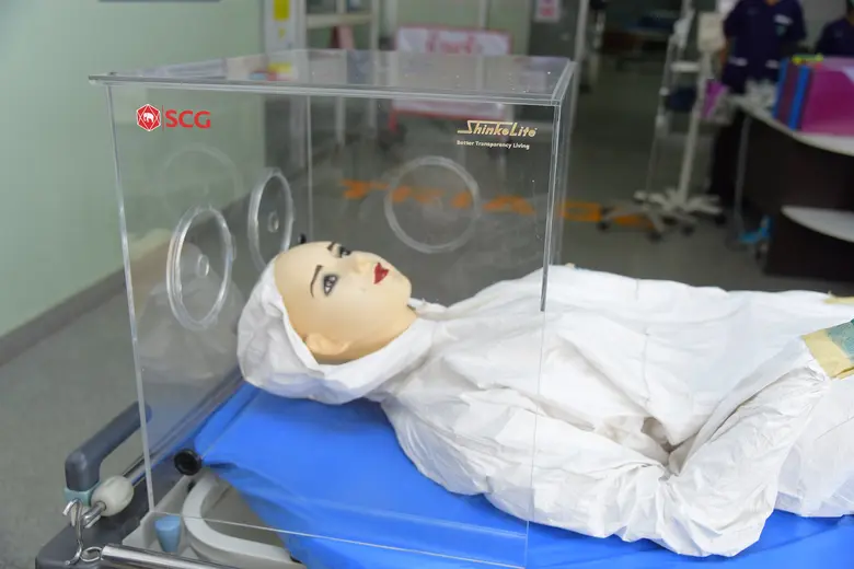 ทั้งนี้ ธุรกิจเคมิคอลส์ เอสซีจี ได้จัดทำกล่องป้องกันเชื้อฟุ้งกระจาย ซึ่งผลิตจากแผ่นอะคริลิก Shinkolite ที่มีความใส สะอาด ช่วยให้แพทย์มองเห็นได้อย่างชัดเจนขณะใช้ครอบบริเวณศีรษะของผู้ป่วยติดเชื้อที่ระบบหายใจล้มเหลวระหว่างปฏิบัติการใส่ท่อช่วยหายใจ และชุด DIY Aerosol Guard จากเอสซีจี ซึ่งเป็นชุดอุปกรณ์ป้องกันเชื้อฟุ้งกระจายแบบถอดประกอบได้ด้วยตนเอง ติดตั้งได้ง่าย น้ำหนักเบา สามารถเปลี่ยนฟิล์มพลาสติกที่คลุมโครงสร้างได้บ่อยครั้งตามที่ต้องการ จึงสะอาด ปราศจากเชื้อโรค มี 2 รูปแบบ ได้แก่ แบบครึ่งตัว และแบบเต็มตัว ภายในชุด DIY มีอุปกรณ์ครบชุดพร้อมใช้งาน อาทิ ท่อและข้อต่อพีวีซีจากเอสซีจี เพื่อประกอบเป็นโครงสร้าง และแผ่นฟิล์มพลาสติกช่วยลดการฟุ้งกระจายของเชื้อ