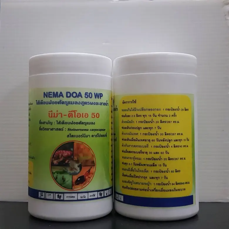 ผลิตภัณฑ์ไส้เดือนฝอยศัตรูแมลง ใช้ป้องกันกำจัดหนอนกินใต้ผิวเปลือกลองกอง ด้วงหมัดผัก ด้วงงวงมันเทศ ด้วงกินรากสตรอเบอรี่ หนอนกระทู้หอม หนอนผีเสื้อในโรงเห็ด และแมลงศัตรูในสนามหญ้า โดยควรพ่นชีวภัณฑ์หลังเวลา 17.00 น. และหลังให้น้ำ ควรเขย่าและคนเป็นระยะเพื่อให้ไส้เดือนฝอยกระจายในน้ำได้ทั่วถึง และใช้ให้หมดหลังเปิดกระป๋อง สำนักวิจัยพัฒนาการอารักขาพืช พร้อมดำเนินการถ่ายทอดเทคโนโลยีการเพาะเลี้ยงขยายไส้เดือนฝอยศัตรูแมลงให้เกษตรกร ผู้ประกอบการ และผู้สนใจที่ต้องการใช้ชีวภัณฑ์ไส้เดือนฝอยศัตรูแมลงแบบผง สามารถสอบถามรายละเอียดเพิ่มเติมได้ที่สำนักวิจัยพัฒนาการอารักขาพืช โทรศัพท์ 02-579-7580 ต่อ 135