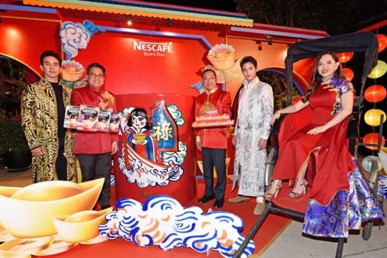 (ที่ 2 จากซ้าย) ผู้อำนวยการบริหารธุรกิจผลิตภัณฑ์กาแฟและครีมเทียม และนางสาวนาริฐา วิบูลยเสข (ขวาสุด) ผู้จัดการธุรกิจกาแฟปรุงสำเร็จ จาก บริษัท เนสท์เล่ (ไทย) จำกัด ต้อนรับศักราชใหม่ปี 2020 ด้วยการเปิดตัวแคมเปญ ชงโชครับตรุษจีนสไตล์อินเตอร์แอคทีฟ นำเสนอประสบการณ์เสริมมงคลผ่านคอลเลคชั่นพรมงคลและสัญลักษณ์มงคล 8 ประการในรูปแบบภาพเคลื่อนไหวอินเตอร์แอคทีฟ 3D อย่างครบวงจรเป็นครั้งแรกในประเทศไทย โดยนำใช้เทคโนโลยีเออาร์ ประกอบด้วยโปรโมชั่นยิ่งใหญ่แห่งปีที่มาพร้อมกับผลิตภัณฑ์เนสกาแฟ เบลนด์ แอนด์ บรู ในบรรจุภัณฑ์ดีไซน์ตรุษจีนที่เป็นลิมิเต็ดเอดิชั่น คอลเลคชั่นแก้วมงคลเนสกาแฟพร้อมคำมงคลจีน สื่อประชาสัมพันธ์ ณ จุดขาย สื่อโฆษณาในรถไฟฟ้า MRT เนสกาแฟฮับทุกสาขา พร้อมด้วย 8 จุดมงคลที่ MRT สถานีวัดมังกร โดยมี สองแบรนด์แอมบาสเดอร์ โป๊ป-ธนวรรธน์ วรรธนะภูติ (ซ้ายสุด) และ เจมส์-จิรายุ ตั้งศรีสุข (ที่สองจากขวา) ร่วมงานซึ่งจัดขึ้นที่ ล้ง 1919