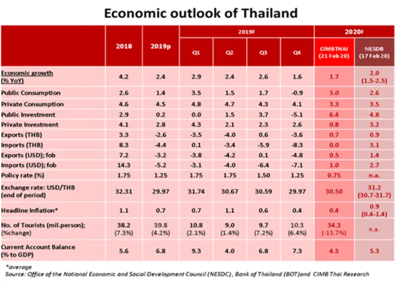 สำนักวิจัยฯปรับลดประมาณการการเติบโตทางเศรษฐกิจปีนี้ลงอีกครั้งจาก 2.3% เหลือ 1.7% จากปัจจัยกดดันเพิ่มเติมคือผลกระทบจากไวรัสโควิด-19 ที่กระทบการท่องเที่ยวและจะลามมาสู่ภาคการผลิตที่จะหดตัวจากการขาดวัตถุดิบจากจีนอีกทอด อย่างไรก็ดี เศรษฐกิจไทยจะเข้าสู่ภาวะการถดถอยทางเทคนิคช่วงครึ่งปีแรก แต่จะฟื้นตัวได้อย่างรวดเร็วเป็นรูปตัว V ในช่วงครึ่งปีหลัง การฟื้นตัวในมุมที่เรามองนี้ ไม่สามารถรอฟ้าฝนให้เป็นใจ จีนหายป่วย การส่งออกและท่องเที่ยวขยายตัวแล้วจะฟื้นได้ แต่ทั้งภาครัฐและเอกชนต้องสามัคคีกันหาหนทางกระตุ้นเศรษฐกิจในรูปแบบที่แตกต่างจากเดิม หาไม่แล้ว เศรษฐกิจไทยอาจฟื้นตัวในรูปตัว U หรือเติบโตทั้งปีนี้ได้เพียง 0.7%