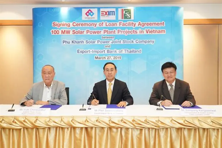 นายพิศิษฐ์ เสรีวิวัฒนา กรรมการผู้จัดการ ธนาคารเพื่อการส่งออกและนำเข้าแห่งประเทศไทย (EXIM BANK) ร่วมลงนามกับนายยุทธ ชินสุภัคกุล ประธานเจ้าหน้าที่บริหาร บริษัท อีสเทอร์น พาวเวอร์ กรุ๊ป จำกัด (มหาชน) (EP) และนายสมพงษ์ กังสวิวัฒน์ ประธานและประธานเจ้าหน้าที่บริหาร บริษัท คอมมิวนิเคชั่น แอนด์ ซิสเต็มส์ โซลูชั่น จำกัด (มหาชน) (CSS) ในสัญญาสนับสนุนทางการเงินของ EXIM BANK จำนวน 65 ล้านดอลลาร์สหรัฐ ให้แก่บริษัท ภูขันธ์ โซล่า พาวเวอร์ จำกัด ซึ่งเป็นบริษัทร่วมทุนระหว่าง EP และ CSS ที่จัดตั้งในเวียดนาม เพื่อก่อสร้างโครงการโรงไฟฟ้าพลังงานแสงอาทิตย์จำนวน 2 แห่งที่จังหวัดฟูเยี้ยน เวียดนาม กำลังการผลิตรวมประมาณ 100 เมกะวัตต์ ณ EXIM BANK สำนักงานใหญ่ เมื่อเร็วๆ นี้
