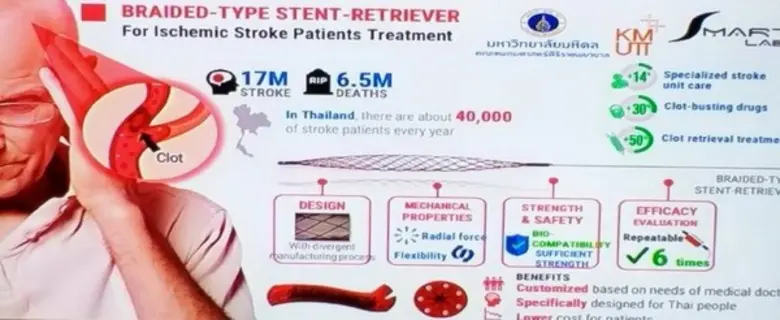 "ในวันนี้ ทีมนักวิจัยจากทั้งสองสถาบันได้ทำงานร่วมกัน จนทำให้มั่นใจได้ว่า นับจากจากนี้ไป ประเทศไทยจะเปลี่ยนเป็นประเทศที่สามารถผลิตอุปกรณ์การแพทย์ที่มีเทคโนโลยี และสามารถช่วยเหลือ รักษาผู้ป่วยได้อย่างมีประสิทธิภาพ โดยมีนักวิจัยของมหาวิทยาลัยเทคโนโลยีพระจอมเกล้าธนบุรี นำโดย รศ.ดร. อนรรฆ ขันธะชวนะ และนักวิจัยจากคณะแพทยศาสตร์ ศิริราชพยาบาล ได้ร่วมมือกันเพื่อ ออกแบบและพัฒนาการผลิตอุปกรณ์ขดลวดค้ำยันที่ใช้ในการลากลิ่มเลือดที่อุดตันในหลอดเลือดสมอง ของผู้ป่วยโรคหลอดเลือดสมองตีบตันระยะเฉียบพลันหรือที่เรียกว่า Retriever stent ที่ต้องใช้เวลาทำการ วิจัยและพัฒนาประมาณ2-3 ปี โดยออกแบบจากวัสดุโลหะผสมจำรูป จากส่วนประกอบของนิกเกิล และ ไทเทเนียม ให้มีคุณสมบัติ ความยืดหยุ่นยิ่งยวด เพื่อให้สามารถที่สอดอุปกรณ์ดังกล่าว เข้าไปเข้าไปใน สายสวน ที่มีขนาดเล็กมากกว่าหลอดเลือด เพื่อสามารถนำพาอุปกรณ์ตัวนี้ไปยังจุดที่ต้องการ เมื่อปล่อย ออกจากสายสวน อุปกรณ์สามารถคืนรูปเดิมและทำการลากลิ่มเลือดออกมาจากหลอดเลือดได้ โดย ไม่ต้องผ่าตัดเปิดแผลใหญ่ ซึ่งเป็นการรักษาที่ทันท่วงที และมีอาการบาดเจ็บจากการผ่าตัดน้อยที่สุด" รศ.ดร.นพ. ฑิตพงษ์กล่าว