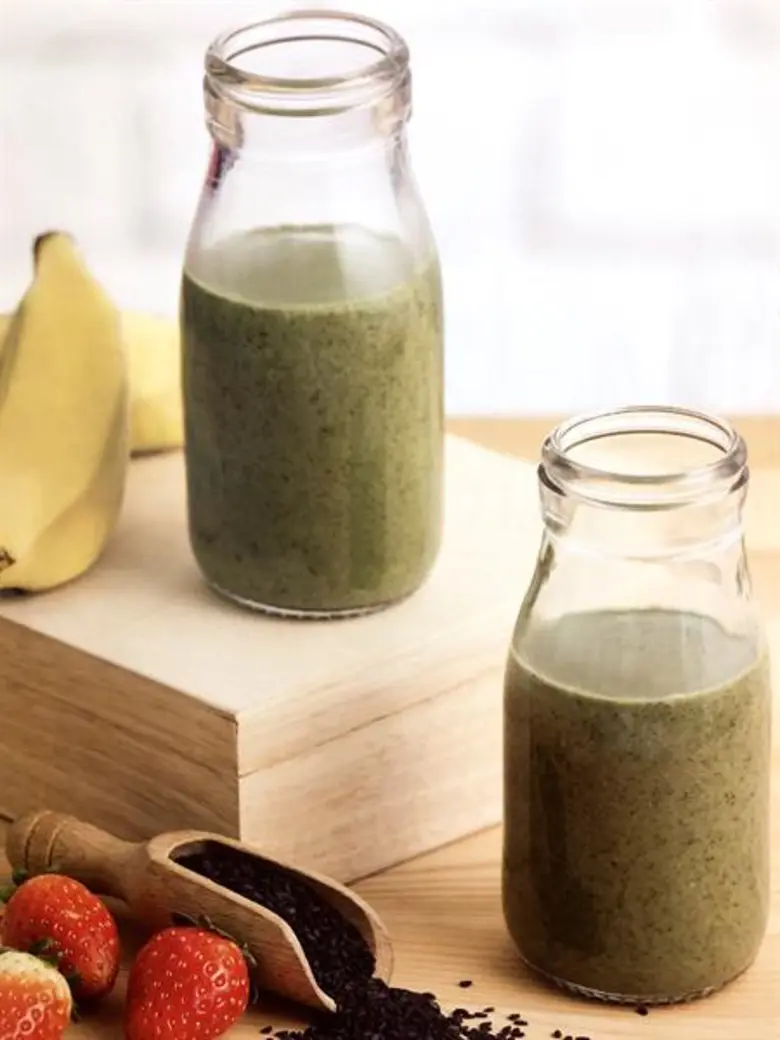 กล้วยน้ำว้า (1/2 ลูกใหญ่) 1 ลูกเล็กสตรอว์เบอร์รี่ 3 ลูกงาดำ 1 ช้อนโต๊ะผักบุ้งจีน 4 ต้นน้ำเปล่า 100 มิลลิลิตรวิธีทำ