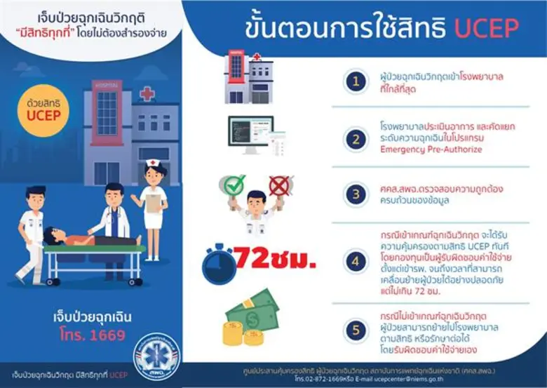 ซึ่งเมื่อมีเหตุฉุกเฉิน ให้รีบนำผู้ป่วยส่งโรงพยาบาลที่ใกล้ที่สุด ทั้งนี้สามารถโทรแจ้งขอความช่วยเหลือผ่านสายด่วน 1669 ได้ตลอด 24 ชั่วโมง จะมีเจ้าหน้าที่รับแจ้งเหตุและคัดกรองภาวะฉุกเฉินของผู้ป่วย และประสานรถพยาบาลฉุกเฉินไปให้ความช่วยเหลือและนำส่งโรงพยาบาล โดยหากอาการเข้าเกณฑ์ฉุกเฉินวิกฤต ค่ารักษาตั้งแต่เข้าโรงพยาบาลจนถึงพ้นภาวะวิกฤตแต่ไม่เกิน 72 ชั่วโมงแรก โรงพยาบาลจะเรียกเก็บเงินจากกองทุน แต่หากพ้นภาวะฉุกเฉินวิกฤตแล้ว ผู้ป่วยหรือญาติสมัครใจจะรักษาต่อที่เดิม ก็ต้องจ่ายค่ารักษาต่อเอง ทั้งนี้หากมีข้อสงสัย สพฉ. ได้ตั้งศูนย์ประสานคุ้มครองสิทธิผู้ป่วยฉุกเฉินวิกฤต หรือ ศคส.สพฉ. เพื่อให้คำปรึกษาแก่ประชาชนในเรื่องการประเมินและตัดสินภาวะฉุกเฉิน ผ่านหมายเลข 02 872 1669 ตลอด 24 ชั่วโมง