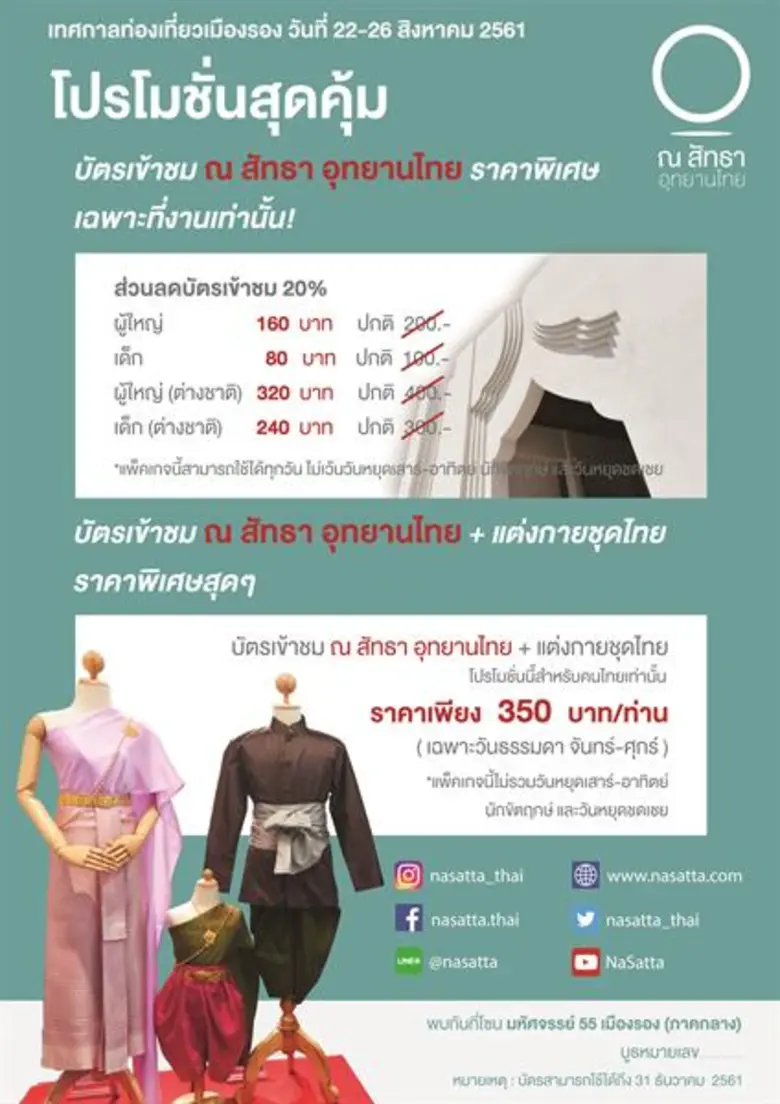 พบความพิเศษมากมาย พร้อมรับของที่ระลึกได้ที่บูธ ณ สัทธา อุทยานไทย โซน มหัศจรรย์ 55 บูธเลขที่ 35 เมืองรอง (ภาคกลาง) บูธเลขที่ T35 ตั้งแต่เวลา 10.00 – 21.00 น. ณ เพลนารี ฮอลล์ ศูนย์ประชุมแห่งชาติสิริกิติ์ หรือสอบถามข้อมูลเพิ่มเติมได้ที่ ณ สัทธา อุทยานไทย โทร. 032 383 333 เว็บไซต์ : www.nasatta.com, อีเมล : [email protected], Instagram / Twitter: nasatta_thai, Facebook : Nasatta.thai, Youtube Channel : NaSatta, Line@ : @nasatta