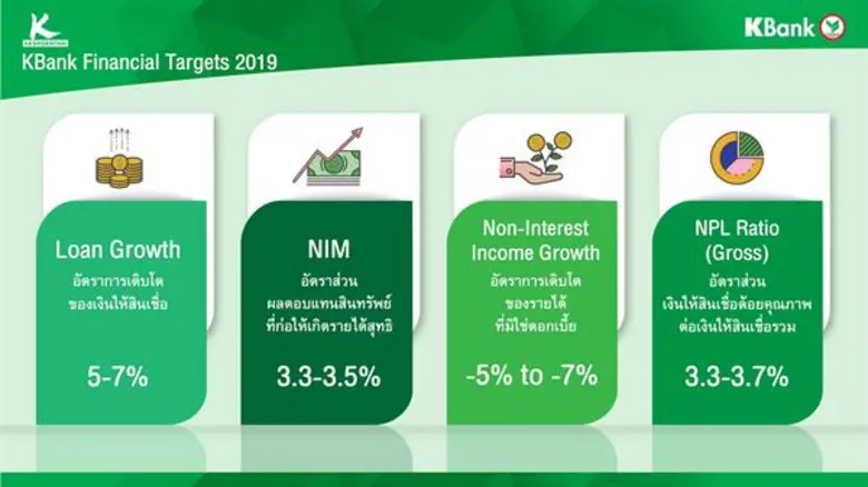 ธนาคารกสิกรไทยได้ประกาศเป้าหมายทางการเงินปี 2562 โดยตั้งเป้าการเติบโตเงินให้สินเชื่อที่ 5-7% ซึ่งจะสอดคล้องกับอัตราการเติบโตของเศรษฐกิจในปีหน้า แบ่งเป็นสินเชื่อธุรกิจลูกค้าบรรษัทเติบโต 3-5% สินเชื่อธุรกิจลูกค้าผู้ประกอบการเติบโต 2-4% และสินเชื่อลูกค้าบุคคลเติบโต 9-12% อัตราผลตอบแทนสินทรัพย์ที่ก่อให้เกิดรายได้สุทธิ (Net Interest Margin:NIM) อยู่ที่3.3-3.5% อัตราการเติบโตของรายได้ที่มิใช่ดอกเบี้ยอยู่ที่ -5 ถึง -7% ในส่วนของคุณภาพสินทรัพย์ คาดว่ามีสัดส่วนเงินให้สินเชื่อด้อยคุณภาพต่อเงินให้สินเชื่อรวม (NPL Ratio) ที่ 3.3-3.7%