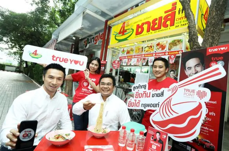 อิทธิพัทธ์ ภูกิจจีรภรณ์ (ที่ 2 จากขวา) ผู้จัดการทั่วไป จัดแคมเปญ "ยิ่งกินชายสี่ ยิ่งได้ทรูพอยท์" ส่ง SMEs ไทย ในยุคสังคมไร้เงินสด สู่ยุคเถ้าแก่ 4.0 มอบสิทธิพิเศษให้ลูกค้าทรู เพียงรับประทานอาหารที่ร้านชายสี่ที่มีสัญลักษณ์ True Point & Pay ทั่วประเทศ ลูกค้าทรูเมื่อสั่งบะหมี่ขนาดธรรมดา ได้เพิ่มเป็นขนาดพิเศษทุกชาม พร้อมรับ 1 ทรูพอยท์ทันที โดยสามารถรับสิทธิ์ผ่านการกดเบอร์ USSD หรือสแกน QR Code ที่ปรากฏบนป้ายในร้าน หรือเพียงใช้ 35 ทรูพอยท์ แลกรับฟรี! บะหมี่ 1 ชาม มูลค่า 35 บาท ตั้งแต่วันที่ 4 ตุลาคม 2561 – 30 กันยายน 2562