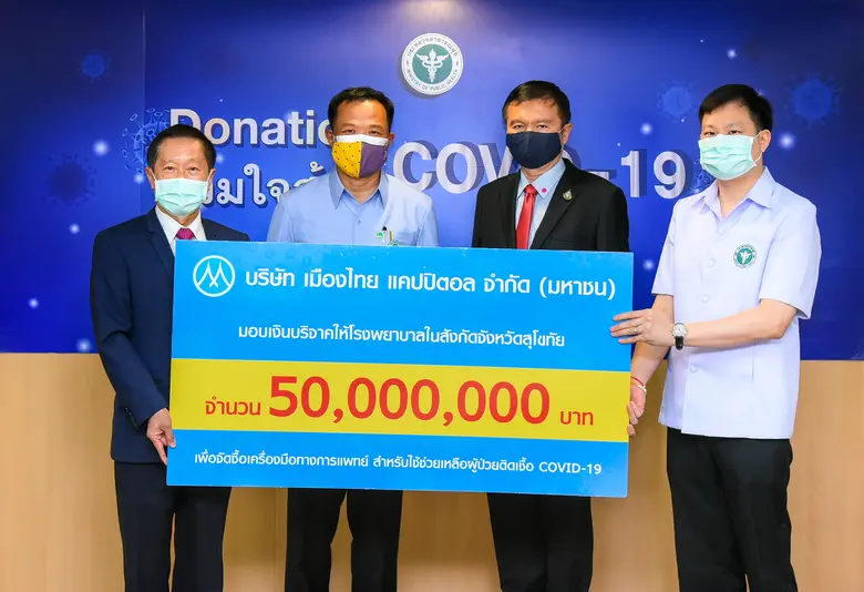 นายอนุทิน ชาญวีรกูล รัฐมนตรีว่าการกระทรวงสาธารณสุข พร้อมด้วย นพ.ภาณุมาศ ญาณเวทย์สกุล ผู้ตรวจราชการกระทรวงสาธารณสุข เขตสุขภาพที่ 2 , ดร.นพ.ปองพล วรปาณิ นายแพทย์สาธารณสุข จังหวัดสุโขทัย รับมอบเงิน จำนวน 50 ล้านบาท จากนายชูชาติ เพ็ชรอำไพ ประธานกรรมการบริหาร บริษัท เมืองไทย แคปปิตอล จำกัด (มหาชน) (MTC) ซึ่งบริจาคให้กับโรงพยาบาลในสังกัดจังหวัดสุโขทัย ผ่านสาธารณสุขจังหวัด เพื่อนำไปใช้ซื้อเครื่องมือทางการแพทย์ เพื่อสู้กับโควิด