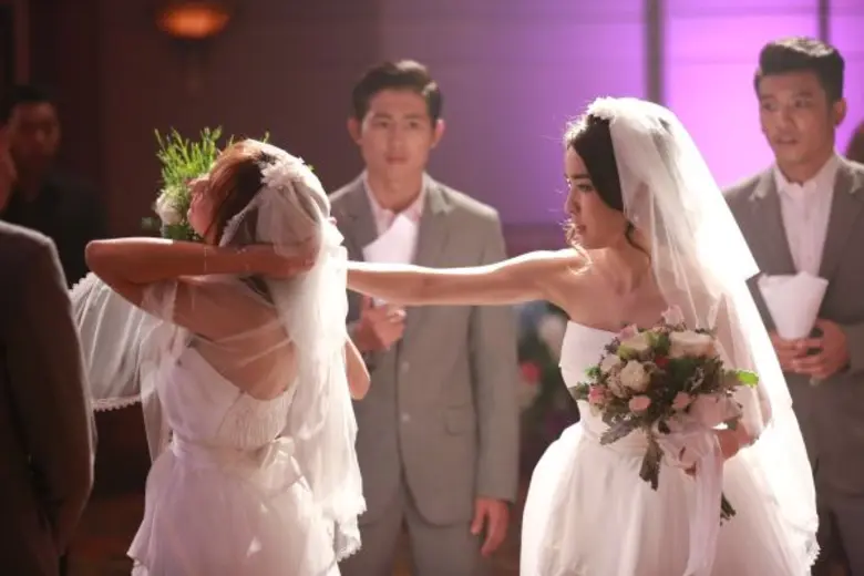 ฉากนี้เรียกว่านักแสดงทั้ง 3 คน โม-ตูมตาม-นารา คงต้องตีกันเหนื่อย โดยเฉพาะ 2 สาว โมและนารา หวนกลับมาฟาดฟันกันอีกครั้ง งานนี้มีหรือจะธรรมดา ผู้กำกับมะเดี่ยว-ชูเกียรติ สั่งปิดห้องจัดงานของโรงแรม พร้อมสั่งทีมงานเคลียร์พื้นที่ให้โมและนาราได้ตบกันแบบเต็มแรง ทั้ง 2 สาว ตั้งอกตั้งใจฟังผู้กำกับบรีฟอารมณ์และบล็อคกิ้งคิวอย่างดิบดี ก่อนจะลองซ้อมต่อบทและคิวตบให้คล่องมือ เริ่มถ่ายจริง นารามาในชุดแต่งงานสีขาวเดินยิ้มอย่างมีความสุข ถือช่อดอกไม้เข้ามาหาตูมตาม ก่อนที่จะถูกโมที่มาในชุดแต่งงานเหมือนกันพุ่งเข้ามากระชากหัวนาราด้วยความแค้นที่แย่งตูมตามไป พร้อมทั้งประกาศว่าจะแต่งงานกับตูมตามด้วย ทำให้นาราโมโหและต่อว่าโมที่แพ้แล้วแต่ไม่ยอมจบ ด้านโมยังคงอารมณ์เดือดพร้อมตบไม่สนใจฟังนาราพูด ยืนยันจะเป็นเจ้าสาวของตูมตามให้ได้ ทำเอานาราเห็นท่าไม่ดีเลยแอ๊บแบ๊วทำตัวน่าสงสารต่อหน้าทุกคนในงาน โมเห็นเข้าก็คุมอารมณ์ตนเองไม่ไหวจัดการตบนาราไม่ยั้ง แถมยังพังเค้กแต่งงานจนย่อยยับ กว่าจะถ่ายฉากนี้เสร็จทำเอาโม,นารา ตีกันจนหอบเลยทีเดียว
