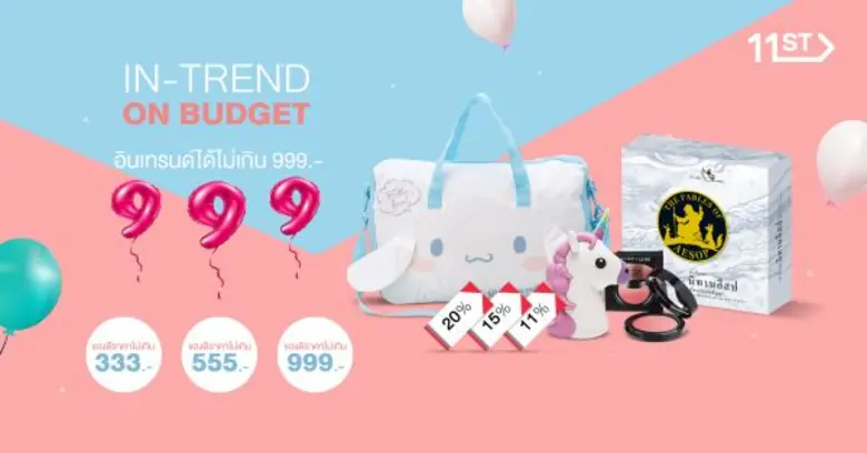 ในขณะที่เทรนด์แฟชั่น สินค้า และแก็ดเจ็ตต่างๆ เปลี่ยนแปลงตลอดเวลา หลายคนคงกำลังมองหาสินค้าอินเทรนด์ที่ช้อปได้ในราคาสบายกระเป๋า เพื่อเอาใจขาช้อป 11street จัดโปรโมชั่น "In-Trend On Budget" นำสินค้าใหม่ล่าสุดและสินค้าขายดีสุดฮอต ทั้งสินค้าอิเล็กทรอนิกส์ แฟชั่น บิวตี้ นันทนาการและอุปกรณ์กีฬา มาจำหน่ายในราคาไม่เกิน 333, 555,และ 999 บาท แถมยังสามารถดาวน์โหลดโบนัสคูปองลดสูงสุด 20% (เมื่อช้อปขั้นต่ำ 750 บาทขึ้นไป ลดสูงสุด 500 บาท) สามารถใช้ลดราคาสินค้าได้ทุกแบบ ทุกประเภท ทั้งเวบ! เริ่มตั้งแต่วันนี้ – 6 ตุลาคม 60 และอีกครั้งในวันที่ 16 – 20 ตุลาคม 60 วันละ 3 รอบตั้งแต่เวลา 09:00 น. 10.30 น. และ 12.00 น. ช้อปสินค้าอินเทรนด์ก่อนใครได้แล้วที่ 11street... อย่าช้า!