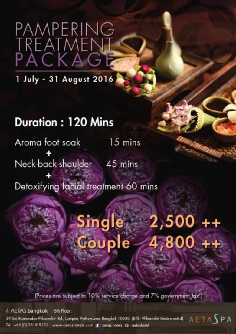เอทัส สปา โรงแรมเอทัส บางกอก ซอยร่วมฤดีออกโปรโมชั่นใหม่ต้อนรับหน้าฝนกับ แพมเพอร์ริ่งทรีทเม้นท์ แพ็กเกจนวดสองชั่วโมงเต็ม เริ่มด้วยนวดเท้าอโรมา 15 นาที ต่อด้วยนวดคอ หลังและไหล่เพื่อยืดเส้นอีก 45 นาที จากนั้นจึงทำการดีทอกซ์ด้วยการนวดหน้าอีก 60 นาที กระตุ้นเซลบริเวณผิวหน้าให้เปล่งปลั่ง ราคาสำหรับแพ็กเกจ 1 ท่าน 2,500 บาท หรือมาเป็นคู่ แพ็กเกจ 2 ท่านในราคา 4,800 บาท นอกจากนี้ทางเอทัส สปายังมีทรีทเม้นท์อีกมากมายให้คุณเลือกผ่อนคลาย