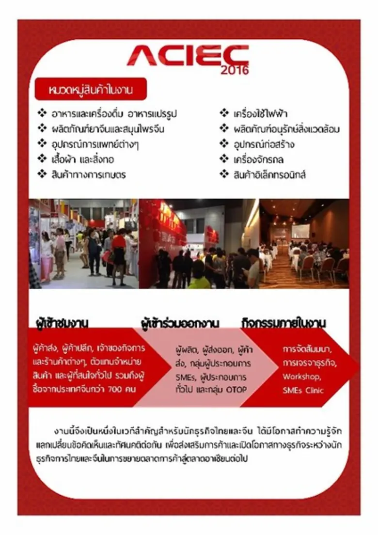 2016 ASEAN (BANGKOK) CHINA IMPORT & EXPORT COMMODITIES FAIR คือ งานมหกรรมแสดงสินค้ามาตรฐานไทยและจีนส่งออกครั้งที่ 6 มีการรวบรวมสินค้าอุปโภคบริโภคกว่า 1,000 รายการ บนพื้นที่การจัดงานของศูนย์แสดงสินค้า อิมแพคเมืองทองธานีกว่า 6,000 ตรม. และมีผู้ประกอบการเข้าร่วมแสดงสินค้ากว่า 300 บริษัท โดยมีการคัดสรรสินค้าคุณภาพส่งออกทั้งโรงงานผู้ผลิตจากไทยและจีน โดยเฉพาะสินค้าจีนได้รับการรับรองคุณภาพจากทางรัฐบาลจีน เพื่อสร้างภาพลักษณ์ในการผลิตสินค้าของผู้ผลิตจากหลายมณฑลในประเทศจีน สินค้าที่นำมาจัดแสดง ได้แก่ อาหารและเครื่องดื่ม, ผลิตภัณฑ์ยาจีนและยาสมุนไพรจีน, อุปกรณ์การแพทย์ต่างๆ, เครื่องจักร, อิเล็กทรอนิคส์, อุปกรณ์การก่อสร้าง, เครื่องจักรกลการเกษตร, อุปกรณ์ทางการเกษตร, เครื่องใช้ไฟฟ้า, ผลิตภัณฑ์อนุรักษ์พลังงานและสิ่งแวดล้อม, อะไหล่เครื่องยนต์และจักรยานยนต์, สิ่งทอ , อาหาร แปรรูป เป็นต้น งานนี้จึงเป็นหนึ่งในเวทีสำคัญสำหรับนักธุรกิจไทยและจีน ได้มีโอกาสทำความรู้จัก แลกเปลี่ยนข้อคิดเห็นและทัศนคติต่อกัน เพื่อส่งเสริมการค้าและเปิด โอกาสทางธุรกิจระหว่างนักธุรกิจการไทยและจีน ในการขยายตลาดการค้าสู่ตลาดอาเซียนต่อไป งานนี้จึงเป็นหนึ่งในเวทีสำคัญสำหรับนักธุรกิจไทยและจีน ได้มีโอกาสทำความรู้จัก แลกเปลี่ยนข้อคิดเห็นและทัศนคติต่อกัน เพื่อส่งเสริมการค้าและเปิดโอกาสทางธุรกิจระหว่างนักธุรกิจการไทยและจีนในการขยายตลาดการค้าสู่ตลาดอาเซียนต่อไป งานนี้จึงเป็นหนึ่งในเวทีสำคัญสำหรับนักธุรกิจไทยและจีน ได้มีโอกาสทำความรู้จัก แลกเปลี่ยนข้อคิดเห็นและทัศนคติต่อกัน เพื่อส่งเสริมการค้าและเปิดโอกาสทางธุรกิจระหว่างนักธุรกิจการไทยและจีนในการขยายตลาดการค้าสู่ตลาดอาเซียนต่อไป ข่าวมหกรรมแสดงสินค้ามาตรฐานไทยและจีนส่งออก ข่าวสินค้ามาตรฐานไทยและจีน ข่าวมหกรรมแสดงสินค้า ข่าวเมืองทองธานี ข่าวผู้ประกอบการ