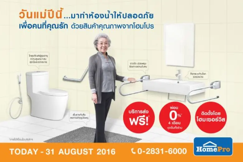และเพื่อร่วมเฉลิมฉลองวันแม่แห่งชาติในปีนี้ที่กำลังจะมาถึง โฮมโปรได้มีการจัดแคมเปญวันแม่ขึ้นเพื่อเป็นการแสดงความรักของลูกที่ห่วงใยแม่ด้วยการเชิญชวน มาทำห้องน้ำให้ปลอดภัยเพื่อคนที่คุณรัก ด้วยสินค้าคุณภาพจากโฮมโปร นำนวัตกรรมที่เป็นมิตรกับสิ่งแวดล้อม และสังคมมาสร้างสรรค์ให้กับผู้บริโภคในยุคปัจจุบัน และอนาคต โดยเฉพาะอย่างยิ่ง Universal Design การออกแบบเพื่อรองรับสังคมผู้สูงวัยที่จะเกิดขึ้นในอนาคต ด้วยการนำนวัตกรรมทั้งด้านการประหยัดพลังงาน และการเตรียมที่อยู่อาศัยให้มีความปลอดภัย และสะดวกสบายสำหรับผู้สูงวัย เพื่อรองรับครอบครัวในสังคมไทยให้อยู่ร่วมกันอย่างมีความสุข ตอบโจทย์ทุกความต้องการของสมาชิกในครอบครัว แนวคิดนี้ยังจะเชื่อมความผูกพันของครอบครัวไทย ได้อย่างสมดุล โดยเฉพาะอย่างยิ่งสำหรับผู้สูงวัยที่ปัจจุบันมีพฤติกรรมไม่เหมือนในอดีต แต่จะมีความคิดตามเทรนด์ใหม่ๆ เสมอ ส่งผลให้กลุ่มผู้สูงวัยหันมาใส่ใจการดูแลสุขภาพ และการสรรหาสิ่งอำนวยความสะดวกสบายให้กับตัวเอง โฮมโปรเองจึงนำเรื่องการดูแลสุขภาพของทุกวัยในครอบครัวไทย ที่นำการออกแบบ และระบบพร้อมเทคโนโลยีมาใช้ เช่น นวัตกรรมที่เหมาะสำหรับผู้สูงวัย อาทิ ห้องน้ำที่ออกแบบโดยคำนึงถึงความปลอดภัย ความสะดวกสบายในการใช้สอย ระบบพื้นลดแรงกระแทก ช่วยลดความรุนแรงของการบาดเจ็บ หากเกิดการหกล้มกระแทกพื้น อุปกรณ์เสริมเพื่อการใช้งานที่สะดวกขึ้นราวจับช่วยพยุงในการลุก-นั่ง เพื่อให้ยึดจับได้สะดวกใช้ติดในจุดที่ต้องมีการลุก-นั่ง เช่น บริเวณชักโครก ส่วนอาบน้ำ โถสุขภัณฑ์ที่มีความสูงเหมาะสม ลุกนั่งสะดวกสบาย พื้นยางกันลื่นลดการเกิดอุบัติเหตุ ก๊อกแบบก้านโยกเปิด ปิดง่าย
