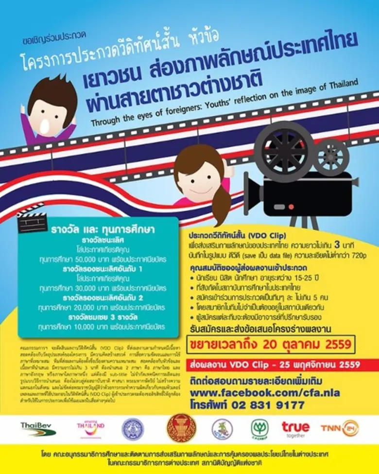 ปิดรับผลงานวันที่ 25 พฤศจิกายน 2559 โครงการประกวดวีดิทัศน์สั้น หัวข้อ "เยาวชน ส่องภาพลักษณ์ประเทศไทยผ่านสายตาชาวต่างชาติ"